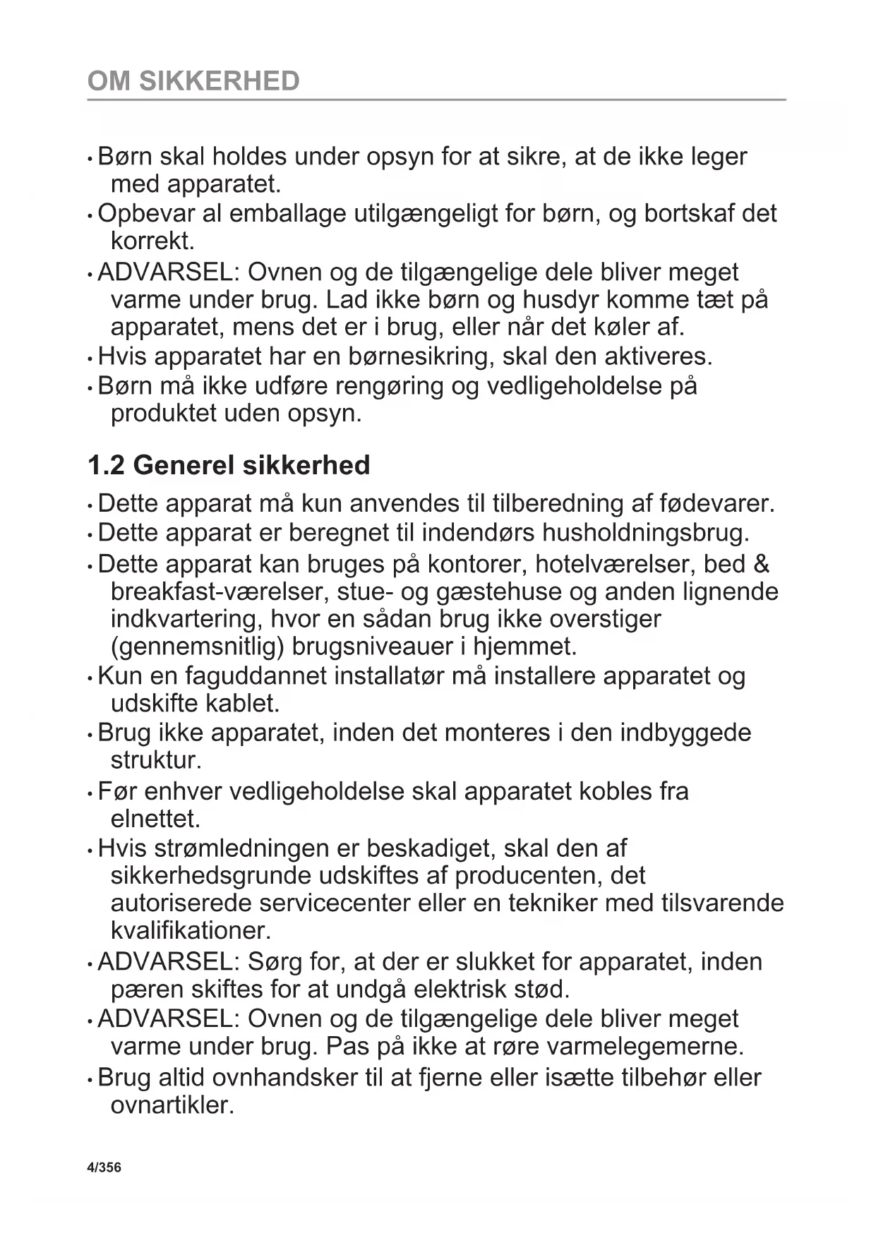 - Apparatet må kun bruges af børn fra 8 år og opefter samt af personer med nedsat fysisk, sensorisk eller psykisk funktionsevne, eller som mangler den nødvendige erfaring eller viden, hvis de er under opsyn eller er blevet instrueret i at bruge apparatet på en sikker måde samt forstår de farer, det indebærer. Børn under 8 år og personer med omfattende og komplekst handicap skal holdes på afstand af apparatet, medmindre de overvåges konstant. 3/356 OM SIKKERHED• Børn skal holdes under opsyn for at sikre, at de ikke leger med apparatet.