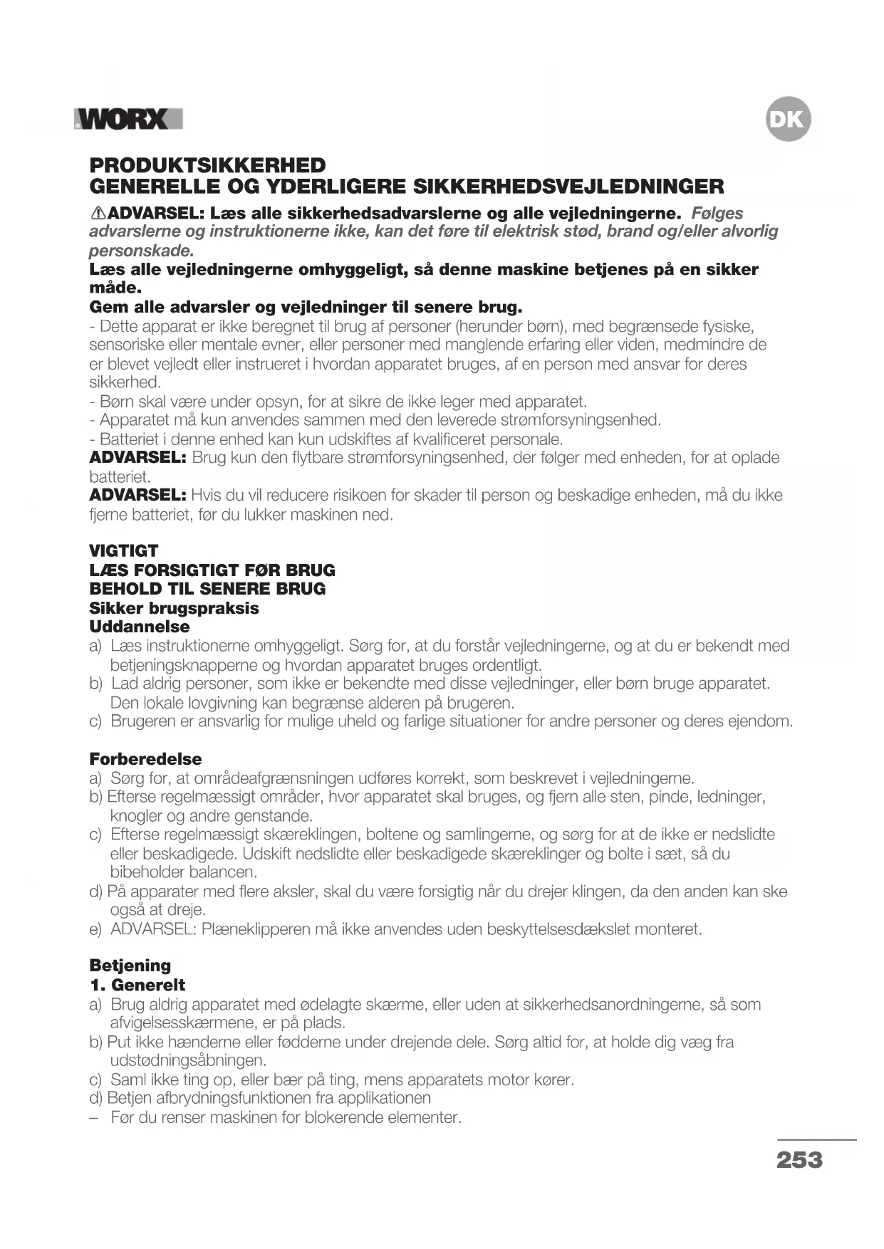 producentens anvisninger eller brugervejledning for, hvordan batterierne oplades korrekt. j) Et batterisæt må ikke efterlades til opladning i længere tid, hvis det ikke anvendes. k) Efter længere opbevaringsperioder kan det være nødvendigt at oplade eller aflade batterisættet flere gange for at op den optimale ydelse. l) Genoplad kun med laderen specificeret af Worx. Anvend ingen anden oplader end den, der specifikt er beregnet til brug med udstyret. m) Brug kun det korrekte batteri til udstyret. n) Batterisættet skal opbevares utilgængeligt for børn. o) Opbevar den originale produktlitteratur til fremtidig brug. p) Batterisættet skal fjernes fra udstyret, når det ikke er i brug. q) Bortskaffes på en miljørigtig måde. r) Bland ikke batterier af forskellig fremstilling, kapacitet, størrelse eller type i enheden. s) Tag ikke batteriet ud af originalemballagen, før det er nødvendigt. t) Vær opmærksom på plus (+) og minus (-) mærkerne på batteriet for at sikre korrekt brug.256