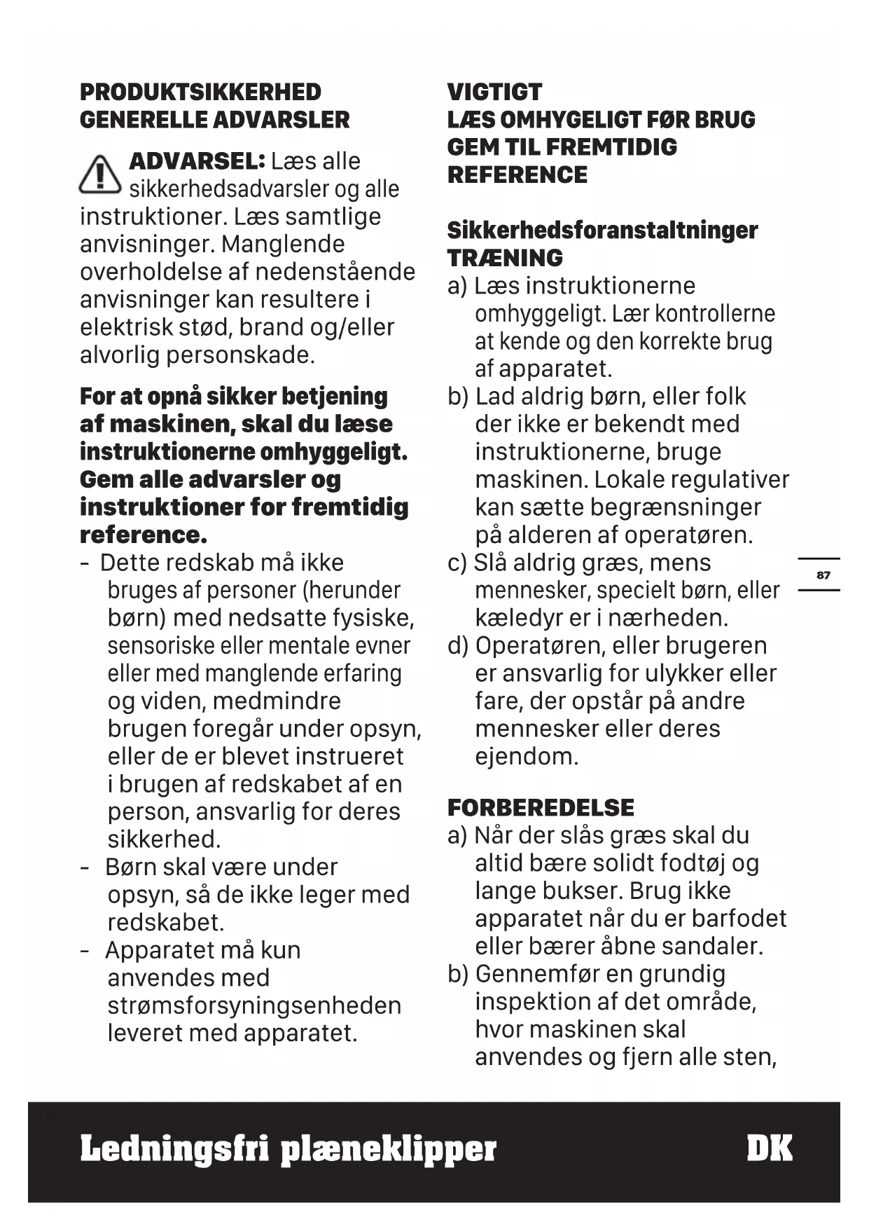 apparatet. b) Lad aldrig børn, eller folk der ikke er bekendt med instruktionerne, bruge maskinen. Lokale regulativer kan sætte begrænsninger på alderen af operatøren. c) Slå aldrig græs, mens mennesker, specielt børn, eller kæledyr er i nærheden. d) Operatøren, eller brugeren er ansvarlig for ulykker eller fare, der opstår på andre mennesker eller deres ejendom. FORBEREDELSE a) Når der slås græs skal du altid bære solidt fodtøj og lange bukser. Brug ikke apparatet når du er barfodet eller bærer åbne sandaler. b) Gennemfør en grundig inspektion af det område, hvor maskinen skal anvendes og fjern alle sten,88 Ledningsfri plæneklipper DK pinde, tråd, ben, og andre fremmedlegemer. c) Før brug skal du altid udføre en visuel inspektion for at se om bladene, bladboltene og skæreenheden ikke er slidt eller beskadiget. Udskift slidte eller beskadigede blade og bolte i sæt, for at bevare balancen; Udskift beskadigede og ulæselige skilter. DRIFT a) Slå kun græs i dagslys eller i god kunstigt lys. b)Undgå at bruge plæneklipperen i vådt græs, hvis det er muligt. c) Hold altid dit fodfæste på hældninger. d)Gå, løb aldrig; e) Ved brug af roterende maskiner på hjul, skal der slås på tværs af hældninger, aldrig op og ned. f) Udvis ekstrem forsigtighed, når du ændrer retning på hældninger. g)Slå ikke på ekstreme hældninger. h)Udvis ekstrem forsigtighed når du bakker eller trækker plæneklipperen i mod dig.
