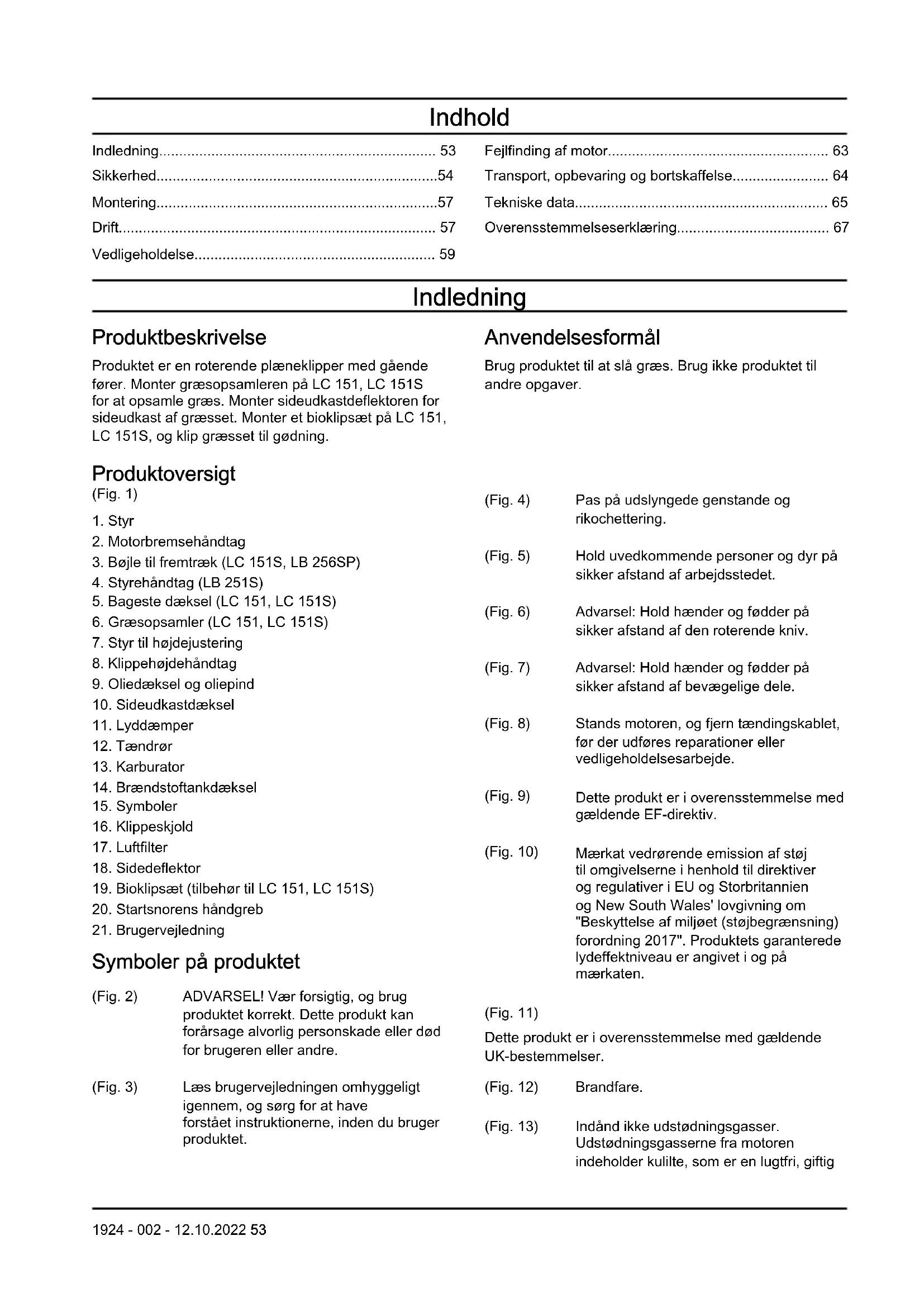 Symboler på produktet (Fig. 2) ADVARSEL! Vær forsigtig, og brug produktet korrekt. Dette produkt kan forårsage alvorlig personskade eller død for brugeren eller andre. (Fig. 3) Læs brugervejledningen omhyggeligt igennem, og sørg for at have forstået instruktionerne, inden du bruger produktet. (Fig. 4) Pas på udslyngede genstande og rikochettering. (Fig. 5) Hold uvedkommende personer og dyr på sikker afstand af arbejdsstedet. (Fig. 6) Advarsel: Hold hænder og fødder på sikker afstand af den roterende kniv. (Fig. 7) Advarsel: Hold hænder og fødder på sikker afstand af bevægelige dele. (Fig. 8) Stands motoren, og fjern tændingskablet, før der udføres reparationer eller vedligeholdelsesarbejde. (Fig. 9) Dette produkt er i overensstemmelse med gældende EF-direktiv. (Fig. 10) Mærkat vedrørende emission af støj til omgivelserne i henhold til direktiver og regulativer i EU og Storbritannien og New South Wales' lovgivning om "Beskyttelse af miljøet (støjbegrænsning) forordning 2017". Produktets garanterede lydeffektniveau er angivet i og på mærkaten. (Fig. 11) Dette produkt er i overensstemmelse med gældende UK-bestemmelser. (Fig. 12) Brandfare. (Fig. 13) Indånd ikke udstødningsgasser. Udstødningsgasserne fra motoren indeholder kulilte, som er en lugtfri, giftig 1924 - 002 - 12.10.2022 53og meget farlig gasart. Undlad at starte motoren indendørs eller i lukkede rum. (Fig. 14) Varm overflade. (Fig. 15) Fyld motoren med olie, før du starter produktet. Bemærk: Andre symboler/mærkater på produktet henviser til certificeringskrav i visse handelsområder. Produktansvar Som nævnt i produktansvarsbestemmelserne hæfter vi ikke for skader forårsaget af vores produkt, hvis: