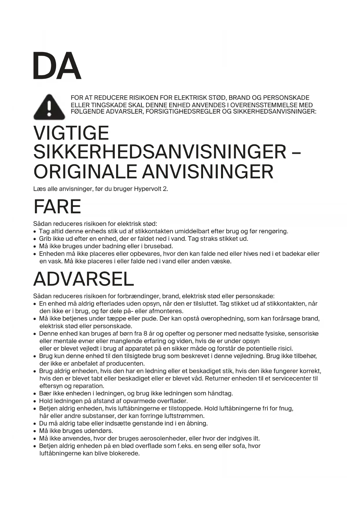 - Hypervolt 2 må kun anvendes på tørre, rene overflader på kroppen ved at trykke let på og bevæge den hen over kroppen i ca. tres (60) sekunder pr. område. Hypervolt 2 må kun anvendes på områder af kroppen med blødt væv og må ikke anvendes på nogen hårde eller knoglede områder af kroppen, herunder hovedet. Stop straks brugen af Hypervolt 2, hvis du oplever smerte eller ubehag, bortset fra let muskelømhed. Du kan opleve at få blå mærker ved brug af Hypervolt 2, uanset trykindstillingen, og hvis du får blå mærker, bør du ikke bruge Hypervolt 2 på det pågældende område, før det blå mærke er væk. Du bør også undgå at bruge Hypervolt 2 på blå mærker, læsioner, udslæt eller irriterede eller beskadigede områder af huden, indtil de er helet. Når du bruger Hypervolt 2, skal du sørge for at holde fingre, tæer, hår og andre kropsdele væk fra bagsiden af hovedtilbehøret for at undgå klemning eller sammenfiltring af håret. Hypervolt 2 må kun oplades med den dobbeltisolerede 18 V DC Hyperice-oplader (modelnummer MX24Z2-1801000), der blev leveret sammen med enheden. Lad ikke Hypervolt 2 oplade natten over, og efterlad ikke Hypervolt 2 uden opsyn under opladning eller brug. Brug ikke Hypervolt 2 eller en vibrations-enhed uden forudgående godkendelse fra din læge, hvis nogen af følgende tilstande gør sig gældende: