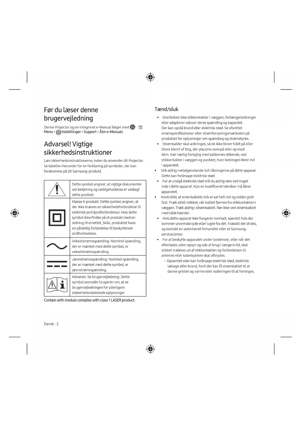 - De här licenserna kanske inte stöds beroende på modell och geografiskt område. The terms HDMI and HDMI High-Definition Multimedia Interface, and the HDMI Logo are trademarks or registered trademarks of HDMI Licensing Administrator, Inc. in the United States and other countries.Den här sidan har avsiktligen lämnats tom.Dansk - 2 Før du læser denne brugervejledning Denne Projector og en integreret e-Manual følger med ( > Menu > Indstillinger > Support > Åbn e-Manual). Advarsel! Vigtige sikkerhedsinstruktioner Læs sikkerhedsinstruktionerne, inden du anvender dit Projector. Se tabellen herunder for en forklaring på symboler, der kan forekomme på dit Samsung-produkt. Dette symbol angiver, at vigtige dokumenter om betjening og vedligeholdelse er vedlagt dette produkt. Klasse II-produkt: Dette symbol angiver, at der ikke kræves en sikkerhedsforbindelse til elektrisk jord (jordforbindelse). Hvis dette symbol ikke findes på et produkt med en ledning til elnettet, SKAL produktet have en pålidelig forbindelse til beskyttende jordforbindelse. Vekselstrømsspænding: Nominel spænding, der er mærket med dette symbol, er vekselstrømsspænding. Jævnstrømsspænding: Nominel spænding, der er mærket med dette symbol, er jævnstrømsspænding. Advarsel. Se brugervejledning: Dette symbol anmoder brugeren om, at se brugervejledningen for yderligere sikkerhedsrelaterede oplysninger. Contain with module complies with class 1 LASER product. Tænd/sluk