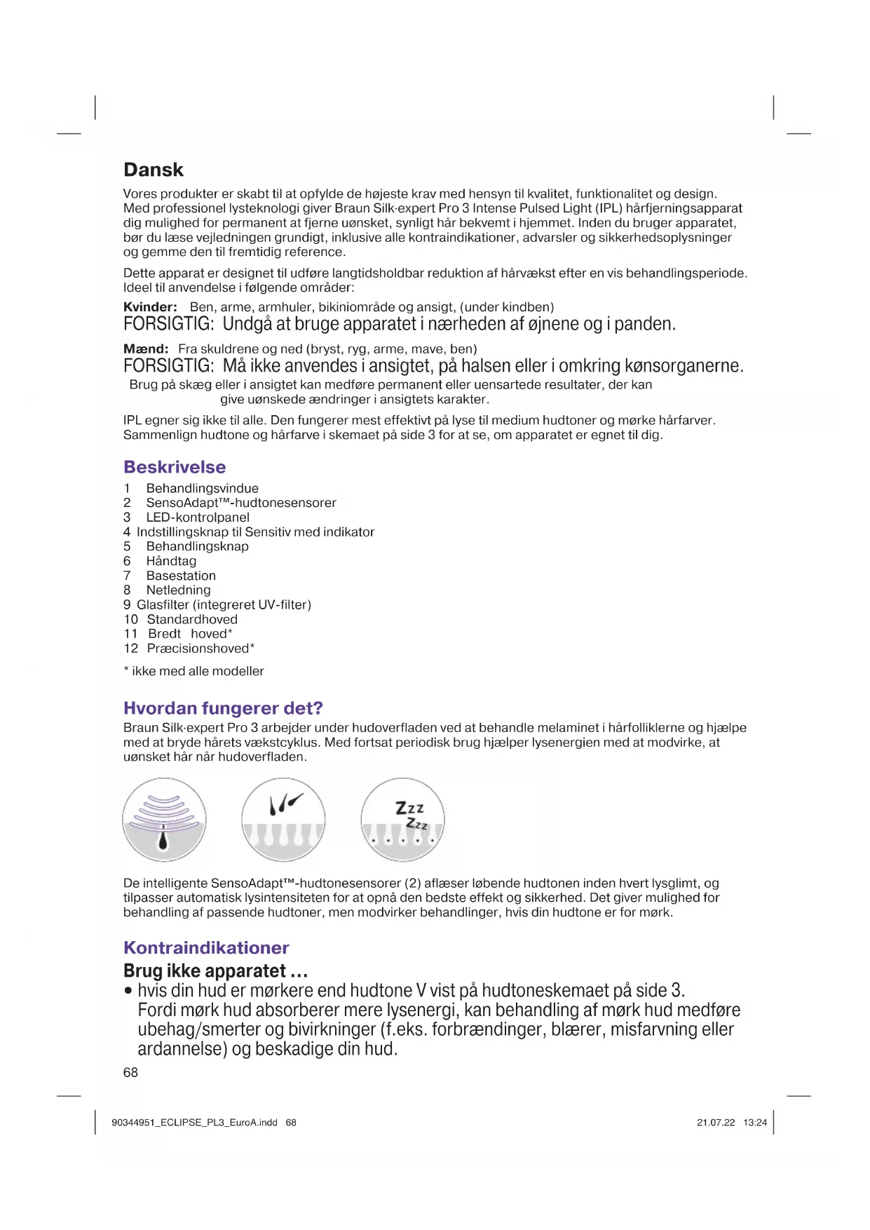 Stop med at bruge apparatet, og kontakt din læge, inden du bruger det igen. 90344951_ECLIPSE_PL3_EuroA.indd 7390344951_ECLIPSE_PL3_EuroA.indd 73 21.07.22 13:2421.07.22 13:2474 I meget sjældne tilfælde: Hævelse og rødmen omkring hårfolliklerne, der forsvinder inden for to til tre dage. Du kan fortsætte med at bruge apparatet som beskrevet, når hævelsen og hudens rødmen omkring hårfolliklerne er forsvundet. Hævelse og rødmen omkring hårfolliklerne, der ikke forsvinder inden for to til tre dage. Stop med at bruge apparatet, og kontakt din læge, inden du bruger det igen. Midlertidige ændringer i hudtonen (lysere eller mørkere). Hvis din hud ændrer farve, skal du stoppe med at bruge apparatet og kontakte din læge. Øget hårvækst i de behandlede områder (mere almindeligt hos personer fra landene omkring Middelhavet). Hvis denne øgede hårvækst fortsætter efter flere behandlinger, skal du stoppe med at bruge apparatet og kontakte din læge. Fejlfinding Følgende fejlfindingsguide anvendes i første omgang til at prøve at løse evt. problemer, der opstår med dette apparat. Problem Løsning Kontrolpanelet lyser ikke, når behandlingsvinduet placeres mod huden. Sørg for, at apparatet er sat i en stikkontakt. Tryk på en vilkårlig knap for at aktivere enheden. Kontroller, at begge hudtonesensorer har fuld kontakt med huden. Flyt eventuelt apparatet, så begge hudtonesensorer får kontakt med huden. Apparatet fungerer ikke på små områder Brug præcisionshovedet (hvis det medfølger) på små, svært tilgængelige områder. Sørg for, at begge hudfarvesensorer er i kontakt med huden. Apparatet blinker langsommere. Apparatet er i varmebeskyttelsestilstand. Lad apparatet køle af for at komme tilbage til normal hastighed. Det er kun den første LED på kontrolpanelet, der lyser rødt. Ugyldig aflæsning af hudtone. Din hud er enten for lys eller for mørk. Apparatet blinker ikke. Sensitiv indikator blinker. Apparatet er deaktiveret. Tryk på en vilkårlig knap for at aktivere den igen. Første LED på kontrolpanelet blinker rødt. Hoved (10, 11 eller 12) er taget af. Sæt det på igen. Kontrolpanelet viser et ukendt mønster med en rød LED, der lyser sammen med enkelte hvide LED. Enhedsfejl. Apparatet fungerer ikke. Kobl det fra stikket, og sæt det til igen. Hvis fejlen fortsætter, skal du kontakte Braun Service Center for reparation. Alle hvide LED blinker. Produktets levetid er overskredet. Maksimalt antal blink (300.000) er nået. Apparatet er i stykker, revnet eller virker defekt. Brug ikke, hvis håndtaget, basestationen eller netledningen er beskadiget. Hvis du er i tvivl om sikkerheden eller har mistanke om at apparatet er beskadiget, skal du ikke bruge det. Bortskaffelse Produktet indeholder elektriske dele til genbrug. Af hensyn til miljøet bør det ikke bortskaffes sammen med husholdningsaffald, men afleveres på en genbrugsstation. 90344951_ECLIPSE_PL3_EuroA.indd 7490344951_ECLIPSE_PL3_EuroA.indd 74 21.07.22 13:2421.07.22 13:2475 Mærker og symboler Basestationen er markeret med følgende symboler: Type BF anvendt del WEEE-mærkat til affaldshåndtering fra EU Udstyr i klasse II Mærket i overensstemmelse med EU’s nummer fra bemyndiget organ Optisk stråling Producent Følg brugsanvisningerne Hold det tørt Dette apparat kan ikke anvendes i badet eller brusebadet UDI Unik enhedsidentifikator Serienummer LOT Parti/Batchnummer Tekniske specifikationer Repetitionshyppighed: hvert 0,6 - 0,67 sekund (afhængig af indstilling), fortsat drift Maks. optisk output: 4,21 J/cm² Pulslængde: 2,6 msek FWHM Bølgelængde: 510-2000 nm Ledningsinput: 100 - 240V~, 50-60Hz, 1,7 - 0,91A Driftstemperatur: 5 °C - 40 °C Optimal driftstemperatur: 15 °C - 30 °C Driftstemperatur: op til 93% R.H. ikke-kondenserende Driftstryk: 700 hPa til 1060 hPa Behandlingsområde (pletstørrelse): Standardhoved: 3 cm² Bredt hoved: 4 cm² Præcisionshoved: 1,5 cm² Transportbetingelser Temperaturområde: – 25°C til 70°C Fugtighed: op til 93% R.H. ikke-kondenserende Tryk: 500 hPa til 1060 hPa Apparatet bruger 300.000 blink og er beregnet til brug af en enkelt bruger i op til 5 år. Apparatet overholder følgende standarder IEC 60601-1:2005/A2:2012, CAN/CSA-C22.2 No. 60601- 1:2014, ANSI/AAMI ES60601-1:2005 / A1:2012, IEC 60601-1-11:2015, IEC 60601-2-57:2011, EN 55014-1:2017, EN 55014-2:2015, EN 61000-3-2:2014, EN 61000-3-3:2013. Oplysningerne heri kan ændres uden varsel. 90344951_ECLIPSE_PL3_EuroA.indd 7590344951_ECLIPSE_PL3_EuroA.indd 75 21.07.22 13:2421.07.22 13:2476 Garanti Braun yder 2 års garanti på dette produkt gældende fra købsdatoen. Inden for garantiperioden vil Braun for egen regning afhjælpe fabrikations- og materialefejl efter vores skøn gennem reparation eller ombytning af apparatet. Denne garanti gælder i alle lande, hvor Braun er repræsenteret. Denne garanti dækker ikke skader opstået ved fejlbetjening, normalt slid eller fejl, som har ringe effekt på værdien eller funktionsdygtigheden af apparatet. Garantien bortfalder ved reparationer udført af andre end de af Braun anviste reparatører og hvor originale Braun reservedele ikke er anvendt. Ved service inden for garantiperioden indleveres eller indsendes hele apparatet sammen med købsbevis til et autoriseret Braun Service Center: www.service.braun.com. Ring 7015 0013 for oplysning om nærmeste Braun Service Center 90344951_ECLIPSE_PL3_EuroA.indd 7690344951_ECLIPSE_PL3_EuroA.indd 76 21.07.22 13:2421.07.22 13:2477 Norsk Våre produkter er laget for å imøtekomme de høyeste standarder når det gjelder kvalitet, funksjonalitet og design. Braun Silk·expert Pro 3 Intense Pulsed Light (IPL) hårfjerningsapparat benytter profesjonell lysteknologi og gjør det mulig for deg å fjerne synlige, uønskede hår hjemme. Før apparatet tas i bruk bør du lese hele bruksanvisningen, inkludert alle kontraindikasjoner, advarsler og sikkerhetsinformasjon, og oppbevare den for fremtidig bruk. Apparatet er designet for å o