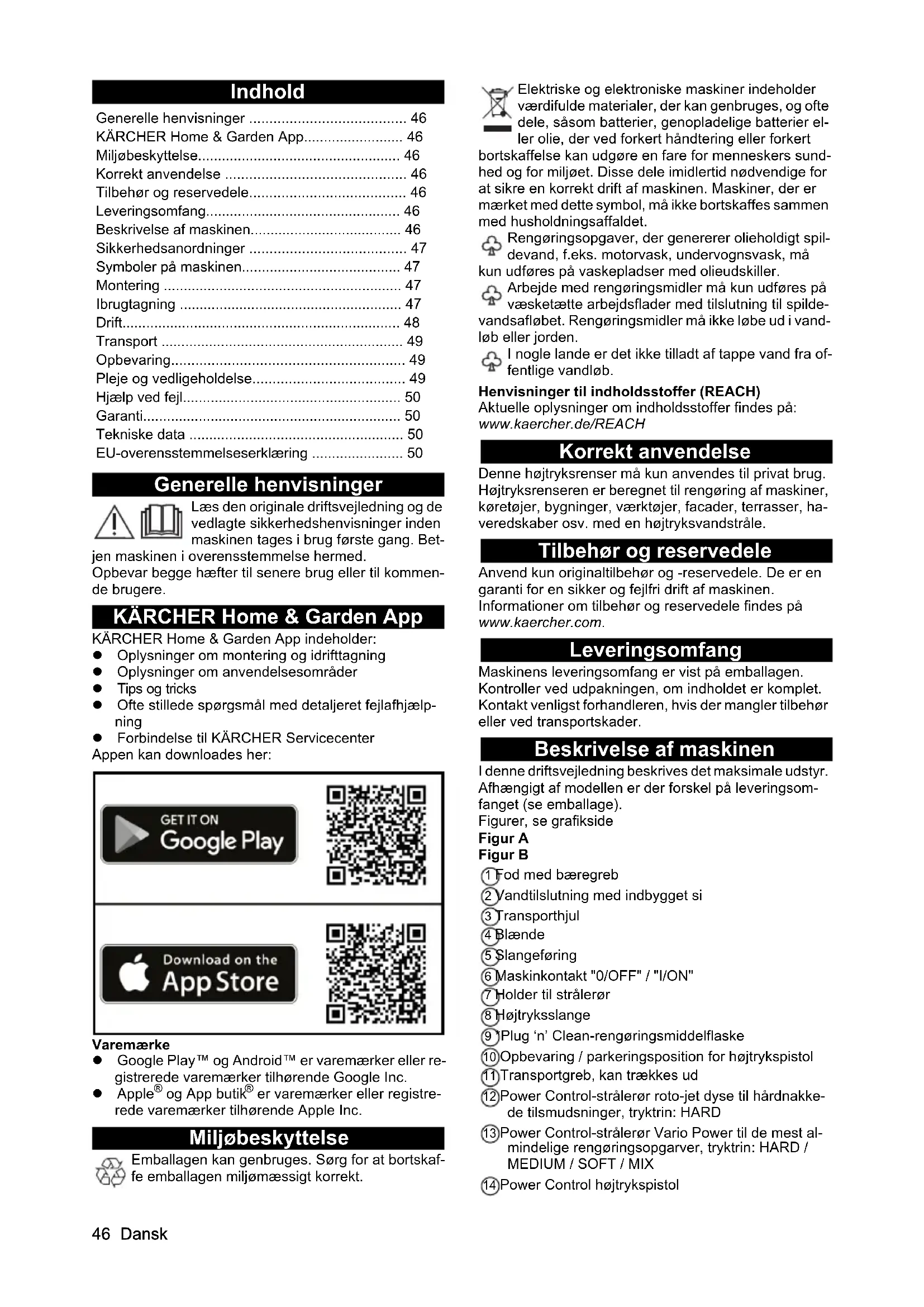 dB(A) 92 92 Chairman of the Board of Management Director Regulatory Affairs & Certification H. Jenner S. Reiser46 Dansk Indhold Generelle henvisninger Læs den originale driftsvejledning og de vedlagte sikkerhedshenvisninger inden maskinen tages i brug første gang. Bet- jen maskinen i overensstemmelse hermed. Opbevar begge hæfter til senere brug eller til kommen- de brugere. KÄRCHER Home & Garden App KÄRCHER Home & Garden App indeholder: Oplysninger om montering og idrifttagning Oplysninger om anvendelsesområder Tips og tricks Ofte stillede spørgsmål med detaljeret fejlafhjælp- ning Forbindelse til KÄRCHER Servicecenter Appen kan downloades her: Varemærke Google Play™ og Android™ er varemærker eller re- gistrerede varemærker tilhørende Google Inc. Apple