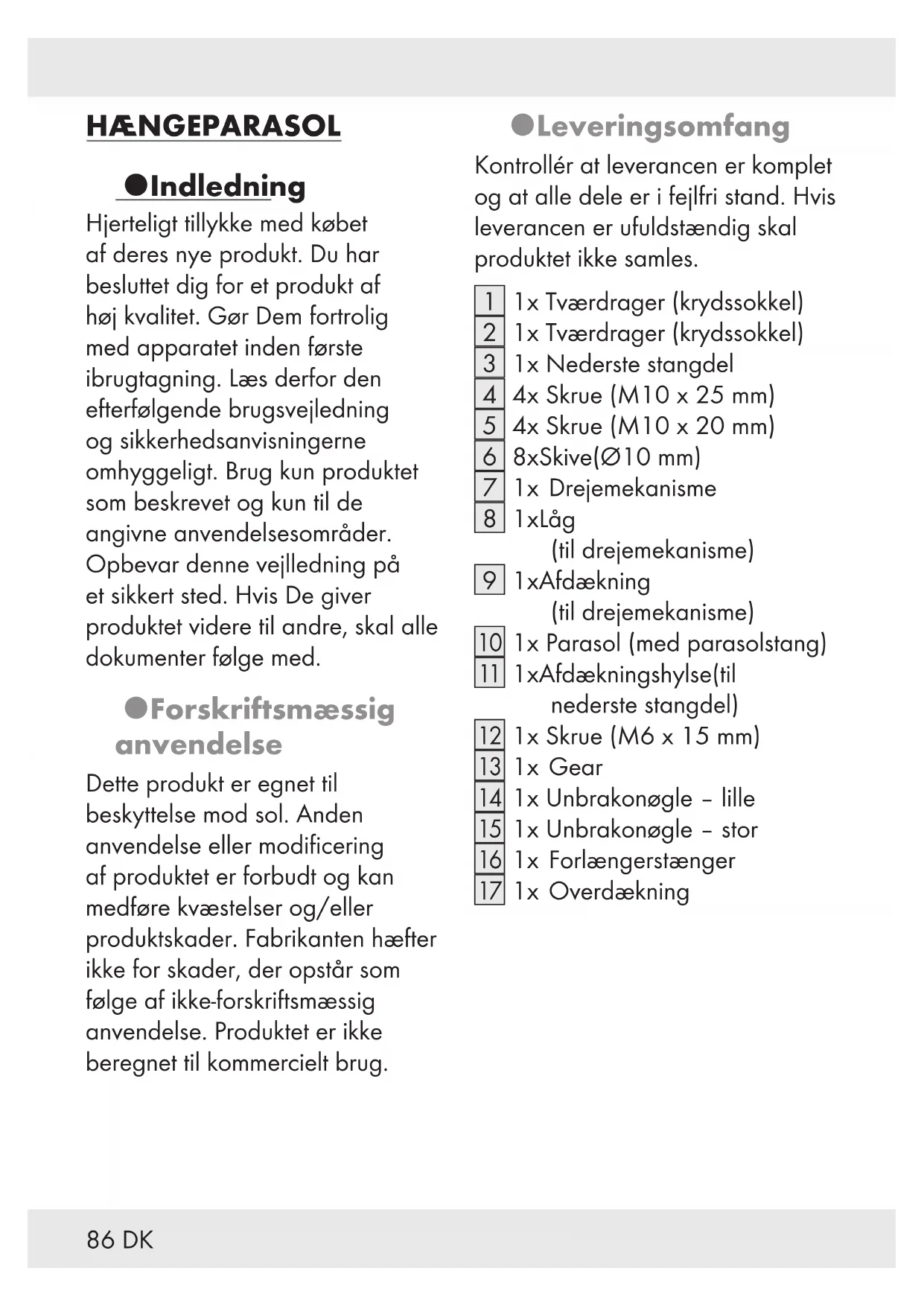 KVÆSTELSER! Sørg for at produktet står i stabil ligevægt på en fast overflade. Før produktet tages i brug: Anbring mindst 110kg på krydssoklen [1] [2] som kontravægt. Anvend altid produktet sammen med 4fortovsfliser med en størrelse på ca. 50x50x4cm (ikke en del af leveringsomfanget). I modsat fald kan produktet vælte. Dette kan også medføre tingskader.