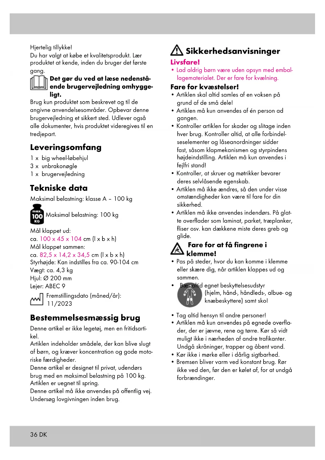 - Kontroller artiklen for skader og slitage inden hver brug. Kontroller altid, at alle forbindel- seselementer og låseanordninger sidder fast, såsom klapmekanismen og styrpindens højdeindstilling. Artiklen må kun anvendes i fejlfri stand!