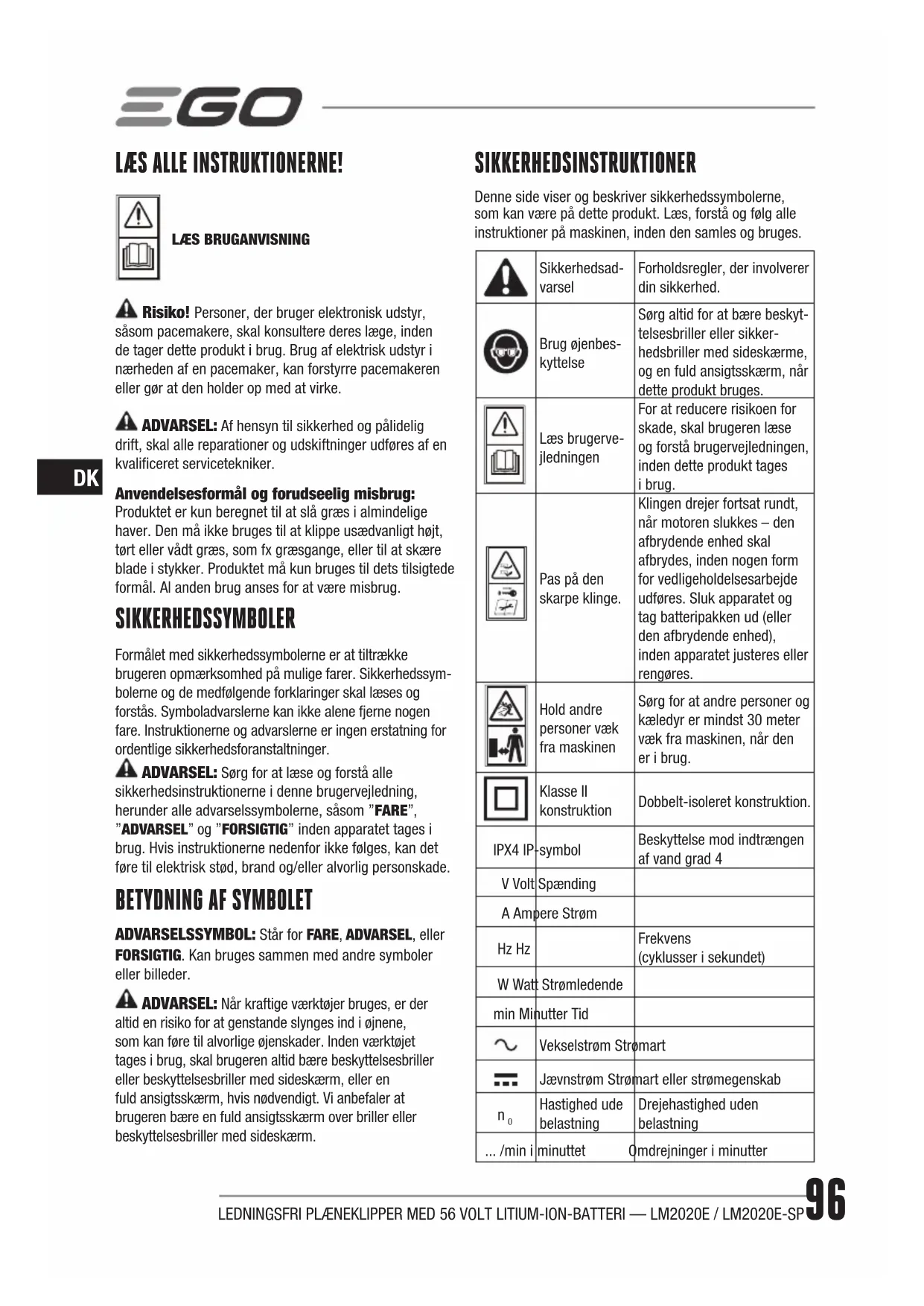 PLÆNEKLIPPER FARE: Denne maskine er fremstillet i henhold til reglerne for sikker drift, som står i denne vejledning. Som med alle kraftige maskiner, kan skødesløshed eller fejlbetjening af brugeren føre til alvorlige skader. Denne maskine kan skade hænder og fødder, og udstøde genstande. Manglende overholdelse af samtlige sikkerhedsinstrukser, kan føre til alvorlige skader eller dødsfald. ADVARSEL: Når du bruger trådløse plæneklippere, skal de grundlæggende sikkerhedsforanstaltninger altid følges, så risikoen for brand, elektrisk stød og personskader reduceres.VIGTIGT SKAL LÆSES GRUNDIGT FØR BRUG. BEHOLD DISSE OPLYSNINGER TIL SENERE REFERENCE. SIKKERHEDSREGLER FOR TRÅDLØSE PLÆNEKLIPPERE:ADVARSEL-UNDGÅ, AT RØRE VED DE DREJENDE KLINGER! OPLÆRING ◾ Læs instruktionerne omhyggeligt. Gør dig bekendt med betjeningsknapperne, og hvordan apparatet bruges korrekt. ◾ Børn eller personer, der ikke er bekendt med disse instruktioner, må aldrig bruge dette apparat. Den lokale lovgivning kan muligvis begrænse, hvor gammel brugeren må være. ◾ Plæneklipperen må ikke bruges, hvis der er børn eller kæledyr i nærheden. ◾ Brugeren af apparatet er ansvarlig for evt. ulykker eller farer, som andre personer eller deres ejendom udsættes for. FORBEREDELSE ◾ Når plæneklipperen bruges, skal brugeren altid bære passende fodtøj og langbukser. ◾ Apparatet må ikke bruges med bare fødder eller med åbne sandaler på. Undgå at bære løstsiddende tøj, eller tøj med hængende snore eller bånd. ◾ Undersøg området, hvor græsset skal slås, og fjern evt. sten, pinde, ledninger, knogler og andre fremmedlegemer. ◾ Inden apparatet tages i brug, skal klingen, klingeboltene og klingesamlingen ses efter for slidt og skader. Nedslidte eller beskadigede klinger og bolte skal skiftes på samme tid, så balancen opretholdes. Beskadigede eller ulæselige etiketter skal skiftes. BETJENING ◾ Plæneklipperen må kun bruges i dagslys eller i stærk kunstigt lys. ◾ Undgå, at bruge plæneklipperen på vådt græs, hvis muligt. ◾ Sørg for, at du har et ordentligt fodfæste på skråninger. ◾ Gå, undgå at løbe. ◾ Hvis du bruger en plæneklipper med hjul på skråninger, skal du køre langs skråningen, og ikke op og ned ad skråningen. ◾ Vær forsigtig, når du vender plæneklipperen om på en skråning. ◾ Undgå, at klippe græs på meget stejle skråninger. ◾ Vær meget forsigtig, hvis du kører baglæns eller trækker apparatet mod dig. ◾ Stop plæneklipperen, hvis den skal vippes for at kører over andre overader end græs, og når den yttes til og fra området, der skal klippes. ◾ Plæneklipperen må aldrig bruges uden at beskyttelsesskærmene eller sikkerhedsudstyret, som fx afbøjningsplader og/eller græsfangere, er sat på apparatet. ◾ Tænd for motoren i henhold til instruktionerne, og med fødderne væk fra klingen. ◾ Apparatet må ikke vippes, når motoren tændes, medmindre apparatet skal vippes for at kunne starte. I dette tilfælde må apparatet ikke vippes mere end absolut nødvendigt, og løft kun den del, der er væk fra brugeren. Sørg altid for at have begge hænder klar til at styre apparatet, inden apparatet sættes på jorden. ◾ Undgå, at starte apparatet, hvis du står foran udstødningen. ◾ Dine hænder eller fødder må ikke komme i nærheden af eller under drejende dele. På plæneklippere med klinger, skal du altid holde dig væg fra udstødningen. ◾ Undgå altid, at samle en genstand op eller bære en genstand, når motoren kører. ◾ Sluk apparatet, og tag batteripakken ud (eller den afbrydende enhed), og sørg for, at alle bevægelige dele er stoppet helt, inden apparatet justeres eller rengøres - gør også dette, hvis: ◾ Du forlader apparatet. ◾ Apparatet skal rengøres, hvis udstødningen eller en anden del er tilstoppet. ◾ Apparatet skal ses efter, rengøres eller repareres. ◾ Apparatet har ramt en fremmed genstand. Se apparatet efter for skader, og foretag de nødvendige reparationer.LEDNINGSFRI PLÆNEKLIPPER MED 56 VOLT LITIUM-ION-BATTERI — LM2020E / LM2020E-SP98