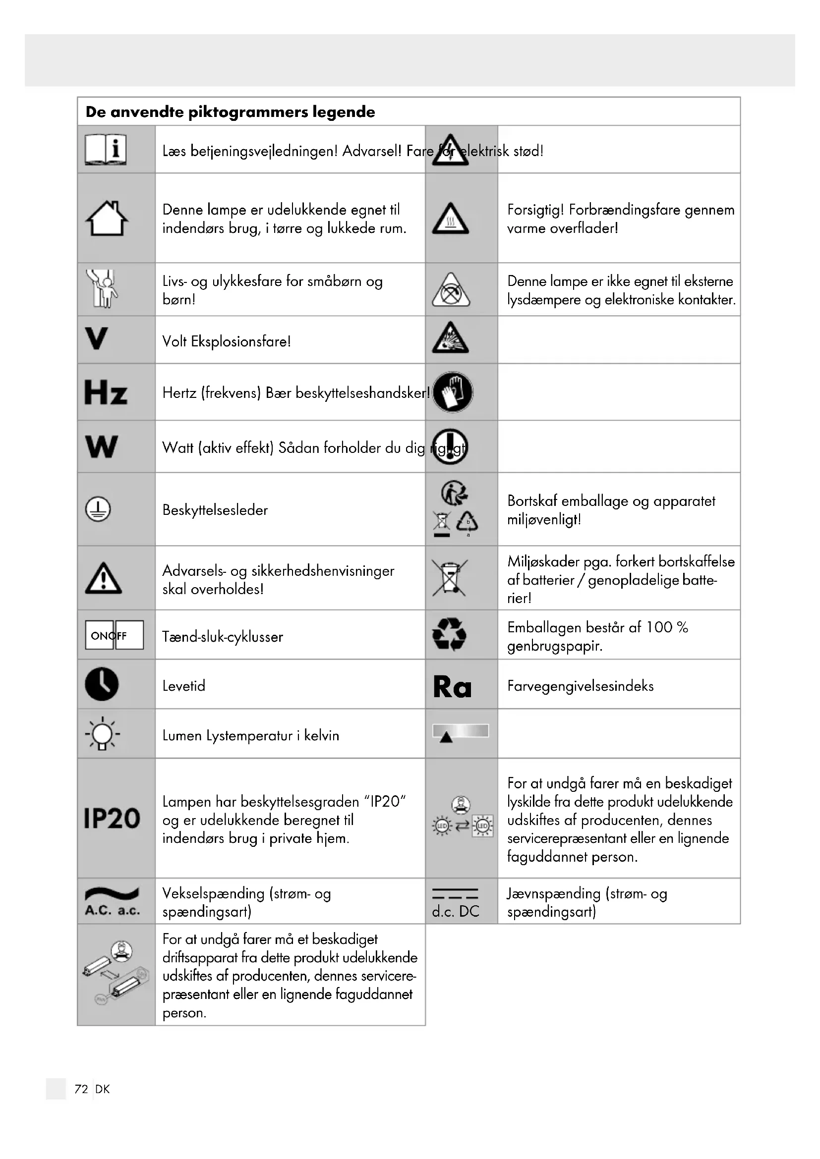 OG BØRN! Lad aldrig børn være uden opsyn med emballagen. Der er fare for kvælning gennem emballagen. Børn undervur- derer ofte farerne. Lad lampen eller emballagen ikke ligge rundt omkring og flyde. Plastikfolier / -poser, kunst- stofdele etc. kan blive til et farligt legetøj for børn. Hold altid børn på afstand af produktet. Dette apparat kan benyttes af børn fra 8 års alderen og opad, samt af personer med forrin- gede fysiske, følelsesmæssige eller mentale ev- ner eller med mangel på erfaring og viden, når de er under opsyn eller er blevet undervist mht. sikker brug af produktet og forstår de derudaf resulterende farer. Børn må ikke lege med ap- paratet. Rengøring og brugervedligeholdelse må ikke foretages af børn uden opsyn. Undgå livsfare på grund af elektrisk stød Overlad installeringen til en faguddannet elek- triker eller til en person, som er instrueret i at udføre elektriske installationer. Kontroller lampen og tilslutningsledningen for eventuelle skader inden hver strømtilslutning. Lampen må aldrig anvendes, hvis der konstateres nogen som helst form for skade. Beskadigede strømledninger betyder livsfare gennem elektrisk stød. Henvend dig ved beska- digelser, reparationer og andre problemer med lampen til et servicested eller en faguddannet elektriker. Fjern sikringen eller slå afbryderen til overstrøms- beskyttelsen i tavlen fra (0-stilling) inden montagen. Kontroller inden monteringen, at den tilstede- værende netspænding stemmer overens med lampens nødvendige driftspænding (se ”Tekni- ske data”). Undgå absolut at lampen kommer i berøring med vand eller andre væsker. De elektriske dele må aldrig åbnes og der må ikke stikkes genstande ind i dem. Denne slags indgreb betyder livsfare gennem elektrisk stød. Lampen må ikke installeres på fugtigt eller le- dende underlag! Undgå fare for brand og tilskadekomst Kontrollér lampen for beskadigelser umiddelbart efter udpakningen. Ret i givet fald henvendelse til servicestedet med henblik på ombytning.