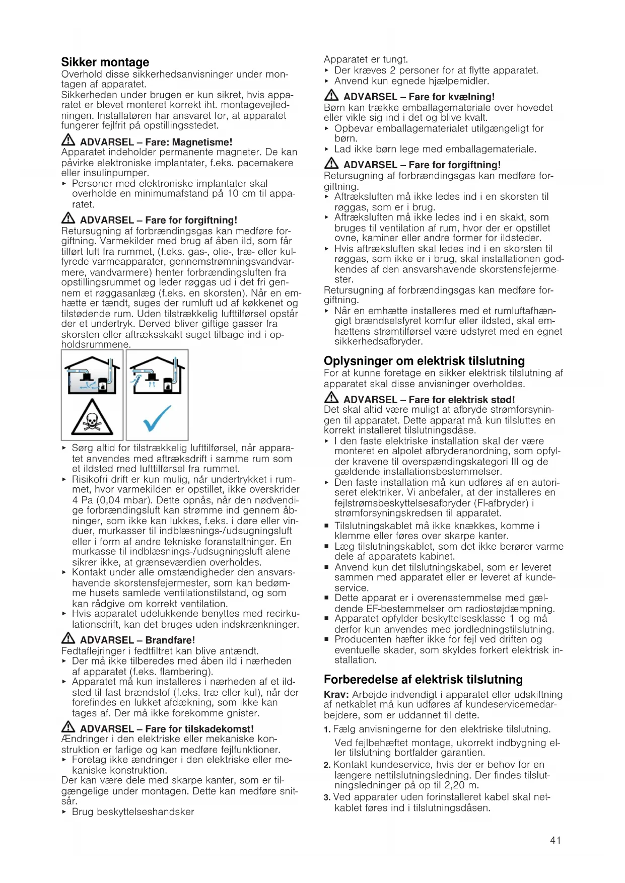 Generelle anvisninger ¡ Læs denne vejledning omhyggeligt igen- nem. ¡ Tilslutningen af apparatet må kun udføres af en autoriseret fagmand. ¡ Strømtilførslen skal afbrydes, før der ud- føres nogen form for arbejde på appara- tet. ¡ Anvend aldrig dette apparat i både eller fartøjer. ¡ Følg bordpladeproducentens anbefa- linger.41 Sikker montage Overhold disse sikkerhedsanvisninger under mon- tagen af apparatet. Sikkerheden under brugen er kun sikret, hvis appa- ratet er blevet monteret korrekt iht. montagevejled- ningen. Installatøren har ansvaret for, at apparatet fungerer fejlfrit på opstillingsstedet. ADVARSEL‒Fare: Magnetisme! Apparatet indeholder permanente magneter. De kan påvirke elektroniske implantater, f.eks. pacemakere eller insulinpumper. ▶ Personer med elektroniske implantater skal overholde en minimumafstand på 10cm til appa- ratet. ADVARSEL‒Fare for forgiftning! Retursugning af forbrændingsgas kan medføre for- giftning. Varmekilder med brug af åben ild, som får tilført luft fra rummet, (f.eks. gas-, olie-, træ- eller kul- fyrede varmeapparater, gennemstrømningsvandvar- mere, vandvarmere) henter forbrændingsluften fra opstillingsrummet og leder røggas ud i det fri gen- nem et røggasanlæg (f.eks. en skorsten). Når en em- hætte er tændt, suges der rumluft ud af køkkenet og tilstødende rum. Uden tilstrækkelig lufttilførsel opstår der et undertryk. Derved bliver giftige gasser fra skorsten eller aftræksskakt suget tilbage ind i op- holdsrummene. ▶ Sørg altid for tilstrækkelig lufttilførsel, når appara- tet anvendes med aftræksdrift i samme rum som et ildsted med lufttilførsel fra rummet. ▶ Risikofri drift er kun mulig, når undertrykket i rum- met, hvor varmekilden er opstillet, ikke overskrider 4Pa(0,04mbar). Dette opnås, når den nødvendi- ge forbrændingsluft kan strømme ind gennem åb- ninger, som ikke kan lukkes, f.eks. i døre eller vin- duer, murkasser til indblæsnings-/udsugningsluft eller i form af andre tekniske foranstaltninger. En murkasse til indblæsnings-/udsugningsluft alene sikrer ikke, at grænseværdien overholdes. ▶ Kontakt under alle omstændigheder den ansvars- havende skorstensfejermester, som kan bedøm- me husets samlede ventilationstilstand, og som kan rådgive om korrekt ventilation. ▶ Hvis apparatet udelukkende benyttes med recirku- lationsdrift, kan det bruges uden indskrænkninger. ADVARSEL‒Brandfare! Fedtaflejringer i fedtfiltret kan blive antændt. ▶ Der må ikke tilberedes med åben ild i nærheden af apparatet (f.eks. flambering). ▶ Apparatet må kun installeres i nærheden af et ild- sted til fast brændstof (f.eks. træ eller kul), når der forefindes en lukket afdækning, som ikke kan tages af. Der må ikke forekomme gnister. ADVARSEL‒Fare for tilskadekomst! Ændringer i den elektriske eller mekaniske kon- struktion er farlige og kan medføre fejlfunktioner. ▶ Foretag ikke ændringer i den elektriske eller me- kaniske konstruktion. Der kan være dele med skarpe kanter, som er til- gængelige under montagen. Dette kan medføre snit- sår. ▶ Brug beskyttelseshandsker Apparatet er tungt. ▶ Der kræves 2 personer for at flytte apparatet. ▶ Anvend kun egnede hjælpemidler. ADVARSEL‒Fare for kvælning! Børn kan trække emballagemateriale over hovedet eller vikle sig ind i det og blive kvalt. ▶ Opbevar emballagematerialet utilgængeligt for børn. ▶ Lad ikke børn lege med emballagemateriale. ADVARSEL‒Fare for forgiftning! Retursugning af forbrændingsgas kan medføre for- giftning. ▶ Aftræksluften må ikke ledes ind i en skorsten til røggas, som er i brug. ▶ Aftræksluften må ikke ledes ind i en skakt, som bruges til ventilation af rum, hvor der er opstillet ovne, kaminer eller andre former for ildsteder. ▶ Hvis aftræksluften skal ledes ind i en skorsten til røggas, som ikke er i brug, skal installationen god- kendes af den ansvarshavende skorstensfejerme- ster. Retursugning af forbrændingsgas kan medføre for- giftning. ▶ Når en emhætte installeres med et rumluftafhæn- gigt brændselsfyret komfur eller ildsted, skal em- hættens strømtilførsel være udstyret med en egnet sikkerhedsafbryder. Oplysninger om elektrisk tilslutning For at kunne foretage en sikker elektrisk tilslutning af apparatet skal disse anvisninger overholdes. ADVARSEL‒Fare for elektrisk stød! Det skal altid være muligt at afbryde strømforsynin- gen til apparatet. Dette apparat må kun tilsluttes en korrekt installeret tilslutningsdåse. ▶ I den faste elektriske installation skal der være monteret en alpolet afbryderanordning, som opfyl- der kravene til overspændingskategori III og de gældende installationsbestemmelser. ▶ Den faste installation må kun udføres af en autori- seret elektriker. Vi anbefaler, at der installeres en fejlstrømsbeskyttelsesafbryder (FI-afbryder) i strømforsyningskredsen til apparatet. ¡ Tilslutningskablet må ikke knækkes, komme i klemme eller føres over skarpe kanter. ¡ Læg tilslutningskablet, som det ikke berører varme dele af apparatets kabinet. ¡ Anvend kun det tilslutningskabel, som er leveret sammen med apparatet eller er leveret af kunde- service. ¡ Dette apparat er i overensstemmelse med gæl- dende EF-bestemmelser om radiostøjdæmpning. ¡ Apparatet opfylder beskyttelsesklasse 1 og må derfor kun anvendes med jordledningstilslutning. ¡ Producenten hæfter ikke for fejl ved driften og eventuelle skader, som skyldes forkert elektrisk in- stallation. Forberedelse af elektrisk tilslutning Krav:Arbejde indvendigt i apparatet eller udskiftning af netkablet må kun udføres af kundeservicemedar- bejdere, som er uddannet til dette.
