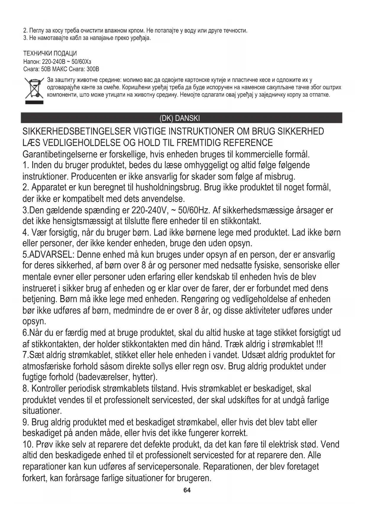 altid den beskadigede enhed til et professionelt servicested for at reparere den. Alle reparationer kan kun udføres af servicepersonale. Reparationen, der blev foretaget forkert, kan forårsage farlige situationer for brugeren. 7.Sæt aldrig strømkablet, stikket eller hele enheden i vandet. Udsæt aldrig produktet for atmosfæriske forhold såsom direkte sollys eller regn osv. Brug aldrig produktet under fugtige forhold (badeværelser, hytter).