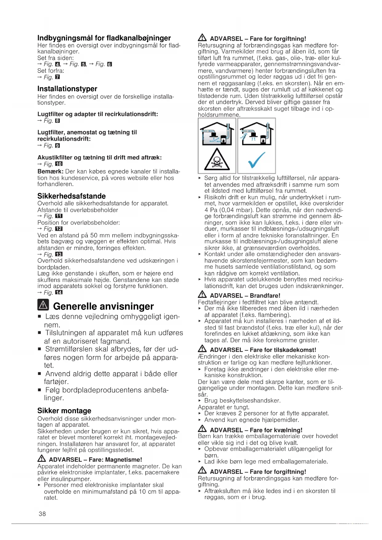 Generelle anvisninger ¡ Læs denne vejledning omhyggeligt igen- nem. ¡ Tilslutningen af apparatet må kun udføres af en autoriseret fagmand. ¡ Strømtilførslen skal afbrydes, før der ud- føres nogen form for arbejde på appara- tet. ¡ Anvend aldrig dette apparat i både eller fartøjer. ¡ Følg bordpladeproducentens anbefa- linger. Sikker montage Overhold disse sikkerhedsanvisninger under mon- tagen af apparatet. Sikkerheden under brugen er kun sikret, hvis appa- ratet er blevet monteret korrekt iht. montagevejled- ningen. Installatøren har ansvaret for, at apparatet fungerer fejlfrit på opstillingsstedet. ADVARSEL‒Fare: Magnetisme! Apparatet indeholder permanente magneter. De kan påvirke elektroniske implantater, f.eks. pacemakere eller insulinpumper. ▶ Personer med elektroniske implantater skal overholde en minimumafstand på 10cm til appa- ratet. ADVARSEL‒Fare for forgiftning! Retursugning af forbrændingsgas kan medføre for- giftning. Varmekilder med brug af åben ild, som får tilført luft fra rummet, (f.eks. gas-, olie-, træ- eller kul- fyrede varmeapparater, gennemstrømningsvandvar- mere, vandvarmere) henter forbrændingsluften fra opstillingsrummet og leder røggas ud i det fri gen- nem et røggasanlæg (f.eks. en skorsten). Når en em- hætte er tændt, suges der rumluft ud af køkkenet og tilstødende rum. Uden tilstrækkelig lufttilførsel opstår der et undertryk. Derved bliver giftige gasser fra skorsten eller aftræksskakt suget tilbage ind i op- holdsrummene. ▶ Sørg altid for tilstrækkelig lufttilførsel, når appara- tet anvendes med aftræksdrift i samme rum som et ildsted med lufttilførsel fra rummet. ▶ Risikofri drift er kun mulig, når undertrykket i rum- met, hvor varmekilden er opstillet, ikke overskrider 4Pa(0,04mbar). Dette opnås, når den nødvendi- ge forbrændingsluft kan strømme ind gennem åb- ninger, som ikke kan lukkes, f.eks. i døre eller vin- duer, murkasser til indblæsnings-/udsugningsluft eller i form af andre tekniske foranstaltninger. En murkasse til indblæsnings-/udsugningsluft alene sikrer ikke, at grænseværdien overholdes. ▶ Kontakt under alle omstændigheder den ansvars- havende skorstensfejermester, som kan bedøm- me husets samlede ventilationstilstand, og som kan rådgive om korrekt ventilation. ▶ Hvis apparatet udelukkende benyttes med recirku- lationsdrift, kan det bruges uden indskrænkninger. ADVARSEL‒Brandfare! Fedtaflejringer i fedtfiltret kan blive antændt. ▶ Der må ikke tilberedes med åben ild i nærheden af apparatet (f.eks. flambering). ▶ Apparatet må kun installeres i nærheden af et ild- sted til fast brændstof (f.eks. træ eller kul), når der forefindes en lukket afdækning, som ikke kan tages af. Der må ikke forekomme gnister. ADVARSEL‒Fare for tilskadekomst! Ændringer i den elektriske eller mekaniske kon- struktion er farlige og kan medføre fejlfunktioner. ▶ Foretag ikke ændringer i den elektriske eller me- kaniske konstruktion. Der kan være dele med skarpe kanter, som er til- gængelige under montagen. Dette kan medføre snit- sår. ▶ Brug beskyttelseshandsker. Apparatet er tungt. ▶ Der kræves 2 personer for at flytte apparatet. ▶ Anvend kun egnede hjælpemidler. ADVARSEL‒Fare for kvælning! Børn kan trække emballagemateriale over hovedet eller vikle sig ind i det og blive kvalt. ▶ Opbevar emballagematerialet utilgængeligt for børn. ▶ Lad ikke børn lege med emballagemateriale. ADVARSEL‒Fare for forgiftning! Retursugning af forbrændingsgas kan medføre for- giftning. ▶ Aftræksluften må ikke ledes ind i en skorsten til røggas, som er i brug.39 ▶ Aftræksluften må ikke ledes ind i en skakt, som bruges til ventilation af rum, hvor der er opstillet ovne, kaminer eller andre former for ildsteder. ▶ Hvis aftræksluften skal ledes ind i en skorsten til røggas, som ikke er i brug, skal installationen god- kendes af den ansvarshavende skorstensfejerme- ster. Retursugning af forbrændingsgas kan medføre for- giftning. ▶ Når en emhætte installeres med et rumluftafhæn- gigt brændselsfyret komfur eller ildsted, skal em- hættens strømtilførsel være udstyret med en egnet sikkerhedsafbryder. Oplysninger om elektrisk tilslutning For at kunne foretage en sikker elektrisk tilslutning af apparatet skal disse anvisninger overholdes. ADVARSEL‒Fare for elektrisk stød! Det skal altid være muligt at afbryde strømforsynin- gen til apparatet. Dette apparat må kun tilsluttes en korrekt installeret tilslutningsdåse. ▶ I den faste elektriske installation skal der være monteret en alpolet afbryderanordning, som opfyl- der kravene til overspændingskategori III og de gældende installationsbestemmelser. ▶ Den faste installation må kun udføres af en autori- seret elektriker. Vi anbefaler, at der installeres en fejlstrømsbeskyttelsesafbryder (FI-afbryder) i strømforsyningskredsen til apparatet. ¡ Tilslutningskablet må ikke knækkes, komme i klemme eller føres over skarpe kanter. ¡ Læg tilslutningskablet, som det ikke berører varme dele af apparatets kabinet. ¡ Anvend kun det tilslutningskabel, som er leveret sammen med apparatet eller er leveret af kunde- service. ¡ Dette apparat er i overensstemmelse med gæl- dende EF-bestemmelser om radiostøjdæmpning. ¡ Apparatet opfylder beskyttelsesklasse 1 og må derfor kun anvendes med jordledningstilslutning. ¡ Producenten hæfter ikke for fejl ved driften og eventuelle skader, som skyldes forkert elektrisk in- stallation. Forberedelse af elektrisk tilslutning Krav:Arbejde indvendigt i apparatet eller udskiftning af netkablet må kun udføres af kundeservicemedar- bejdere, som er uddannet til dette.