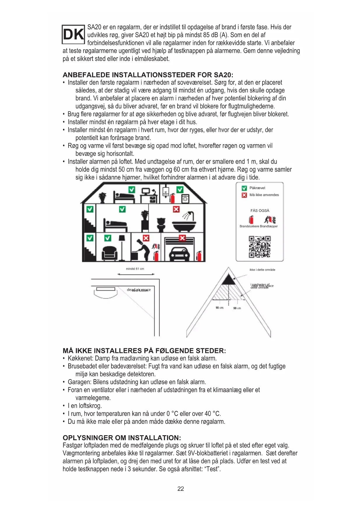For optimal drift anbefaler vi, at røgalmen monteres på loftet. Se ögså installationsvejlednigen. Hvis det ikke er muligt at montere den på loftet, anbefaler vi, at du placerer røgalmenmidt på en væg. Installationspladsen skal ære i rummets naturlige luftstrøm og fri for sidevægge eller skræninger.