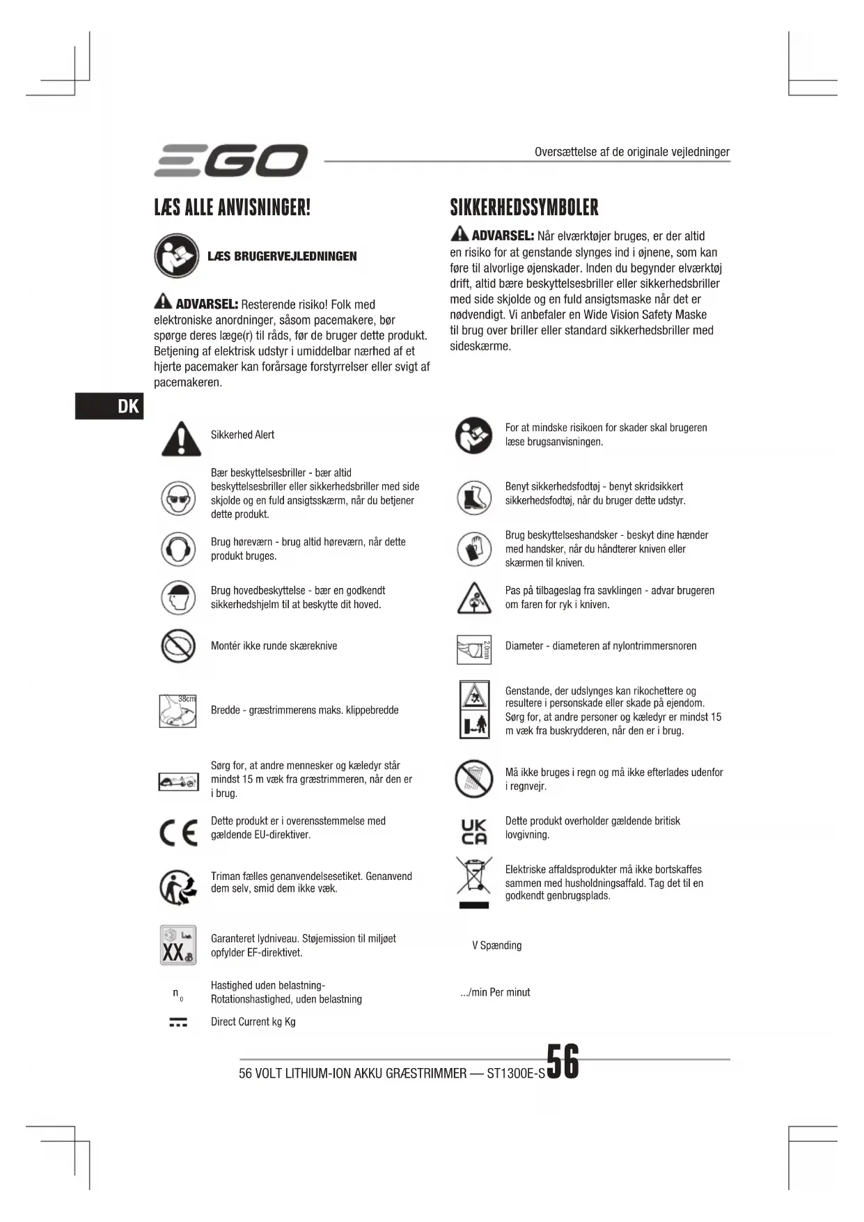 ADVARSEL: Resterende risiko! Folk med elektroniske anordninger, såsom pacemakere, bør spørge deres læge(r) til råds, før de bruger dette produkt. Betjening af elektrisk udstyr i umiddelbar nærhed af et hjerte pacemaker kan forårsage forstyrrelser eller svigt af pacemakeren. SIKKERHEDSSYMBOLER ADVARSEL: Når elværktøjer bruges, er der altid en risiko for at genstande slynges ind i øjnene, som kan føre til alvorlige øjenskader. Inden du begynder elværktøj drift, altid bære beskyttelsesbriller eller sikkerhedsbriller med side skjolde og en fuld ansigtsmaske når det er nødvendigt. Vi anbefaler en Wide Vision Safety Maske til brug over briller eller standard sikkerhedsbriller med sideskærme. Sikkerhed AlertFor at mindske risikoen for skader skal brugeren læse brugsanvisningen.Bær beskyttelsesbriller - bær altid beskyttelsesbriller eller sikkerhedsbriller med side skjolde og en fuld ansigtsskærm, når du betjener dette produkt.Benyt sikkerhedsfodtøj - benyt skridsikkert sikkerhedsfodtøj, når du bruger dette udstyr.Brug høreværn - brug altid høreværn, når dette produkt bruges.Brug beskyttelseshandsker - beskyt dine hænder med handsker, når du håndterer kniven eller skærmen til kniven.Brug hovedbeskyttelse - bær en godkendt sikkerhedshjelm til at beskytte dit hoved.Pas på tilbageslag fra savklingen - advar brugeren om faren for ryk i kniven.Montér ikke runde skæreknive 2.0mmDiameter - diameteren af nylontrimmersnoren 38cm Bredde - græstrimmerens maks. klippebreddeGenstande, der udslynges kan rikochettere og resultere i personskade eller skade på ejendom. Sørg for, at andre personer og kæledyr er mindst 15 m væk fra buskrydderen, når den er i brug. 15m Sørg for, at andre mennesker og kæledyr står mindst 15 m væk fra græstrimmeren, når den er i brug.Må ikke bruges i regn og må ikke efterlades udenfor i regnvejr.Dette produkt er i overensstemmelse med gældende EU-direktiver.Dette produkt overholder gældende britisk lovgivning.Triman fælles genanvendelsesetiket. Genanvend dem selv, smid dem ikke væk.Elektriske affaldsprodukter må ikke bortskaffes sammen med husholdningsaffald. Tag det til en godkendt genbrugsplads.
