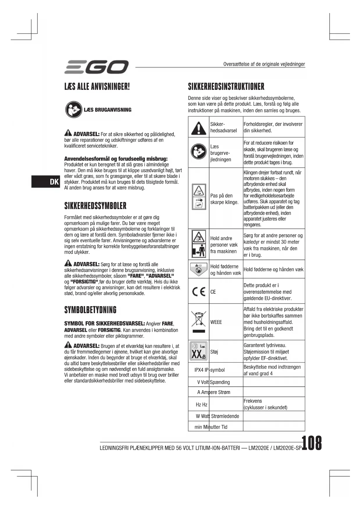 Støj Garanteret lydniveau. Støjemission til miljøet opfylder EF-direktivet.IPX4 IP-symbolBeskyttelse mod indtrængen af vand grad 4V Volt SpændingA Ampere StrømHz HzFrekvens (cyklusser i sekundet)W Watt Strømledendemin Minutter TidOversættelse af de originale vejledningerLEDNINGSFRI PLÆNEKLIPPER MED 56 VOLT LITIUM-ION-BATTERI — LM2020E / LM2020E-SP 109