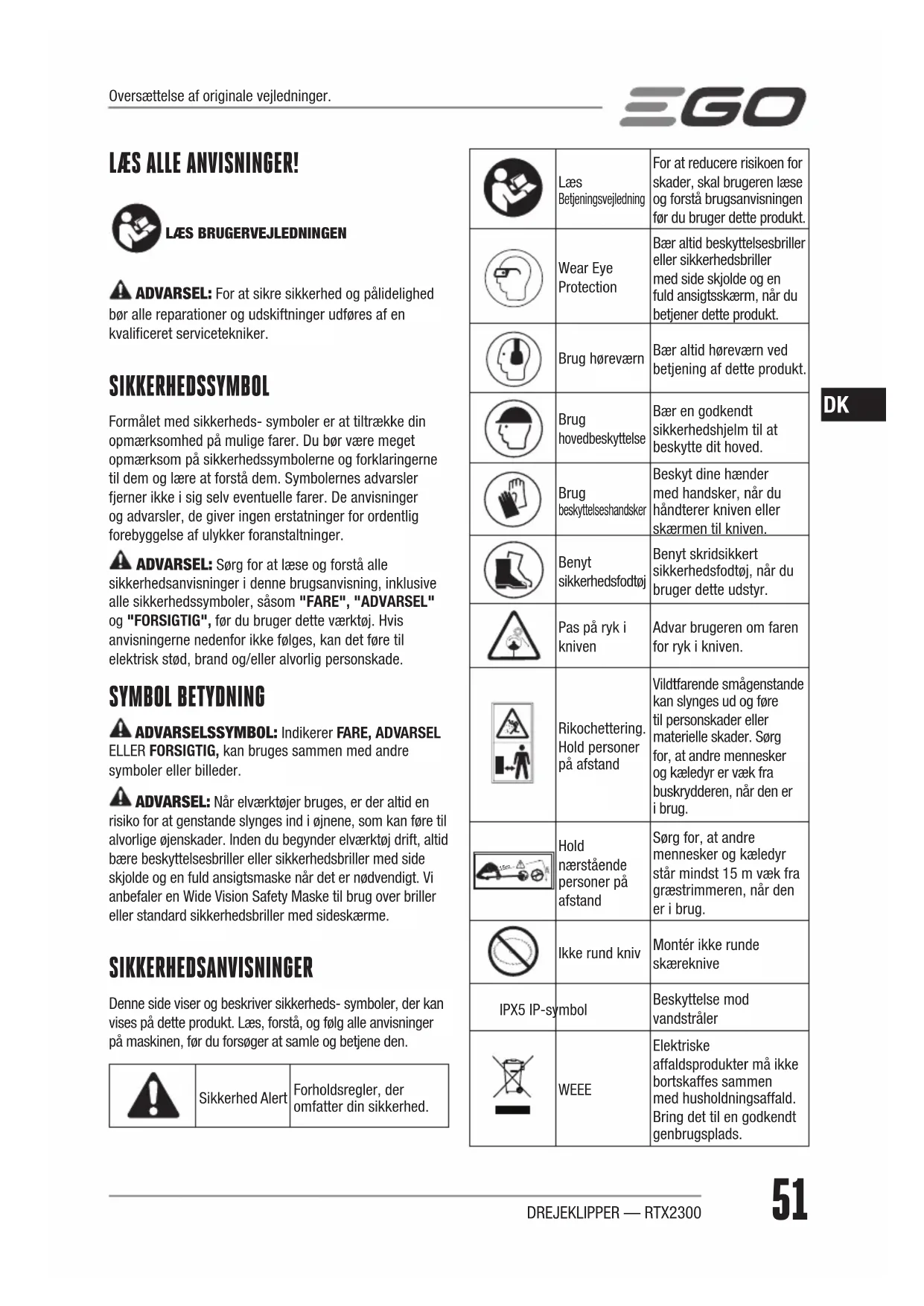 ADVARSEL: For at sikre sikkerhed og pålidelighed bør alle reparationer og udskiftninger udføres af en kvalificeret servicetekniker. SIKKERHEDSSYMBOL Formålet med sikkerheds- symboler er at tiltrække din opmærksomhed på mulige farer. Du bør være meget opmærksom på sikkerhedssymbolerne og forklaringerne til dem og lære at forstå dem. Symbolernes advarsler fjerner ikke i sig selv eventuelle farer. De anvisninger og advarsler, de giver ingen erstatninger for ordentlig forebyggelse af ulykker foranstaltninger. ADVARSEL: Sørg for at læse og forstå alle sikkerhedsanvisninger i denne brugsanvisning, inklusive alle sikkerhedssymboler, såsom "FARE", "ADVARSEL" og "FORSIGTIG", før du bruger dette værktøj. Hvis anvisningerne nedenfor ikke følges, kan det føre til elektrisk stød, brand og/eller alvorlig personskade. SYMBOL BETYDNING ADVARSELSSYMBOL: Indikerer FARE, ADVARSEL ELLER FORSIGTIG, kan bruges sammen med andre symboler eller billeder. ADVARSEL: Når elværktøjer bruges, er der altid en risiko for at genstande slynges ind i øjnene, som kan føre til alvorlige øjenskader. Inden du begynder elværktøj drift, altid bære beskyttelsesbriller eller sikkerhedsbriller med side skjolde og en fuld ansigtsmaske når det er nødvendigt. Vi anbefaler en Wide Vision Safety Maske til brug over briller eller standard sikkerhedsbriller med sideskærme. SIKKERHEDSANVISNINGER Denne side viser og beskriver sikkerheds- symboler, der kan vises på dette produkt. Læs, forstå, og følg alle anvisninger på maskinen, før du forsøger at samle og betjene den. Sikkerhed Alert Forholdsregler, der omfatter din sikkerhed. Læs Betjeningsvejledning For at reducere risikoen for skader, skal brugeren læse og forstå brugsanvisningen før du bruger dette produkt. Wear Eye Protection Bær altid beskyttelsesbriller eller sikkerhedsbriller med side skjolde og en fuld ansigtsskærm, når du betjener dette produkt. Brug høreværn Bær altid høreværn ved betjening af dette produkt. Brug hovedbeskyttelse Bær en godkendt sikkerhedshjelm til at beskytte dit hoved. Brug beskyttelseshandsker Beskyt dine hænder med handsker, når du håndterer kniven eller skærmen til kniven. Benyt sikkerhedsfodtøj Benyt skridsikkert sikkerhedsfodtøj, når du bruger dette udstyr. Pas på ryk i kniven Advar brugeren om faren for ryk i kniven. Rikochettering. Hold personer på afstand Vildtfarende smågenstande kan slynges ud og føre til personskader eller materielle skader. Sørg for, at andre mennesker og kæledyr er væk fra buskrydderen, når den er i brug. 15m Hold nærstående personer på afstand Sørg for, at andre mennesker og kæledyr står mindst 15 m væk fra græstrimmeren, når den er i brug. Ikke rund kniv Montér ikke runde skæreknive IPX5 IP-symbol Beskyttelse mod vandstråler WEEE Elektriske affaldsprodukter må ikke bortskaffes sammen med husholdningsaffald. Bring det til en godkendt genbrugsplads. Oversættelse af originale vejledninger.DREJEKLIPPER — RTX230052