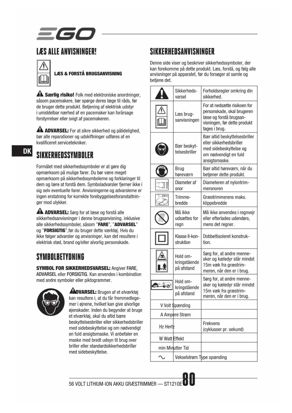græstrimmeren, kan være yderst farligt at anvende dem, og/eller de kan skade værktøjet. ◾ For at mindske risikoen for alvorlig personskade, så brug aldrig ståltråd eller snor forstærket med metal eller andet materiale i stedet for trimmersnor af nylon. Ståltrådsstykker kunne løsne sig og blive kastet ud med høj hastighed mod operatøren eller omkringstående. ◾ For at mindske risikoen for personskade ved tab af kontrol, skal man aldrig arbejde på en stige eller på ethvert andet usikkert underlag. Hold aldrig trimmerdelen over hoftehøjde. ◾ Hvis der opstår situationer, der ikke er dækket i denne vejledning, så vær forsigtig og brug din gode dømmekraft. Kontakt EGO’s servicecenter for at få hjælp. ◾ Oplad ikke batteripakken i regnvejr, eller hvor der er vådt. ◾ Brug kun med de batteripakker og opladere, der er anført nedenfor: BATTERI OPLADER BA1120E, BA2240E, BA2800, BA3360, BA4200 CH5500E, CH2100E ◾ Batteripakken skal fjernes fra apparatet, før det kasseres. ◾ Batteriet skal bortskaffes på en sikker måde ◾ Smid ikke batteriet i ilden. Cellerne kan eksplodere. Undersøg de lokale forskrifter for eventuelle særlige anvisninger på bortskaffelse. ◾ Undlad at åbne eller mishandle batteriet. Udsivende elektrolyt er ætsende og kan forårsage skader på øjne eller hud. Det kan være giftigt ved indtagelse. ◾ Udvis omhu i håndtering af batterier for ikke at kortslutte batteriet med ledende materialer, såsom ringe, armbånd og nøgler. Batteriet eller leder kan blive overophedet og forårsage forbrændinger.56 VOLT LITHIUM-ION AKKU GRÆSTRIMMER — ST1210E
