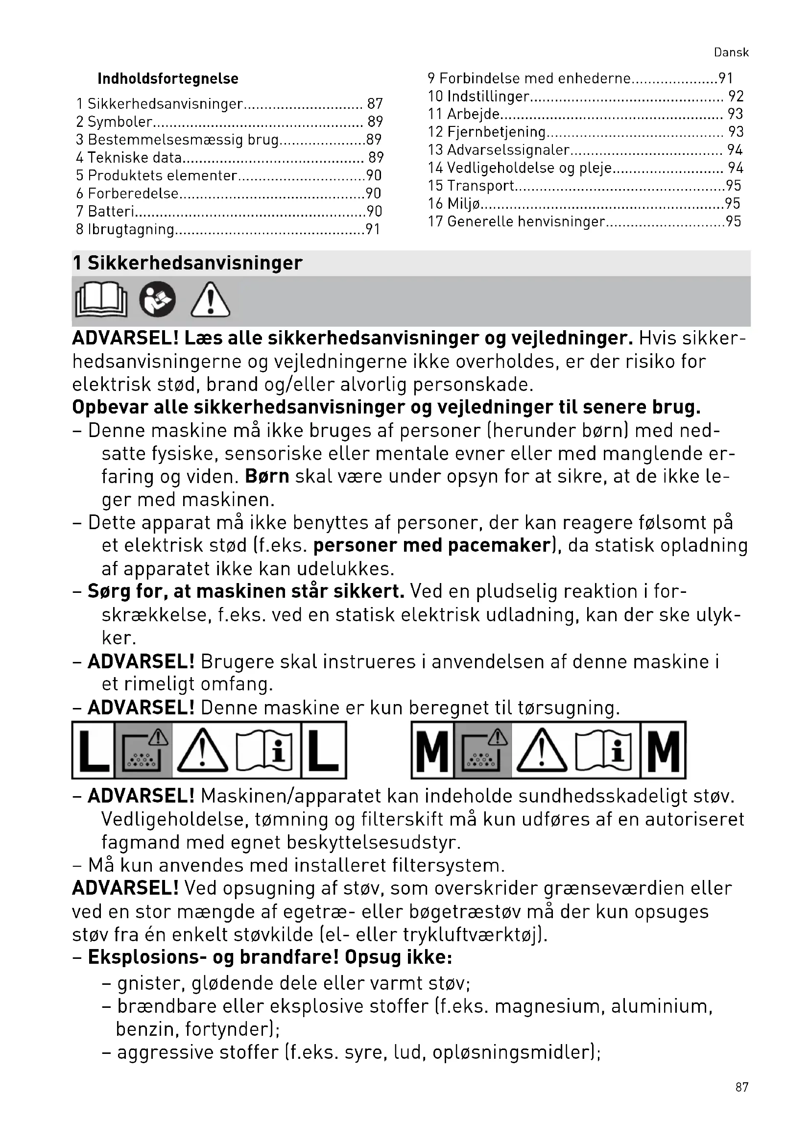 ADVARSEL! Maskinen/apparatet kan indeholde sundhedsskadeligt støv. Vedligeholdelse, tømning og filterskift mA kun udfores af en autoriseret fagmand med egnet beskyttelsesudstyr.