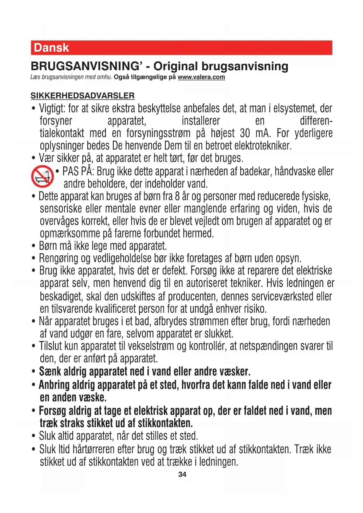 - Forsøg aldrig at tage et elektrisk apparat op, der er faldet ned i vand, men træk straks stikket ud af stikkontakten.