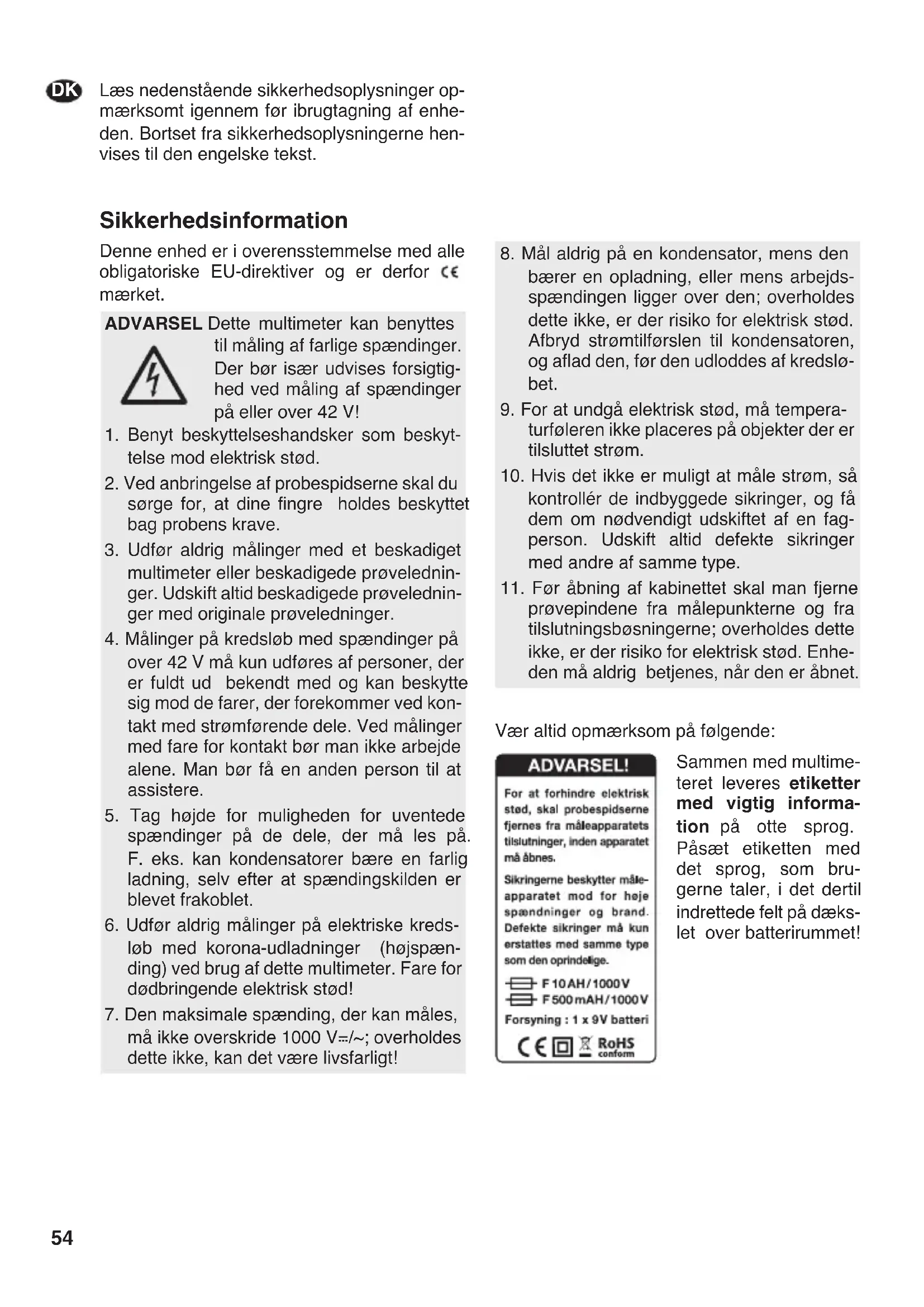 BLæs nedenstående sikkerhedsoplysninger op- mærksomt igennem før ibrugtagning af enhe- den. Bortset fra sikkerhedsoplysningerne hen- vises til den engelske tekst. Sikkerhedsinformation Denne enhed er i overensstemmelse med alle obligatoriske EU-direktiver og er derfor - mærket. Vær altid opmærksom på følgende: Sammen med multime- teret leveres etiketter med vigtig informa- tion på otte sprog. Påsæt etiketten med det sprog, som bru- gerne taler, i det dertil indrettede felt på dæks- let over batterirummet!
