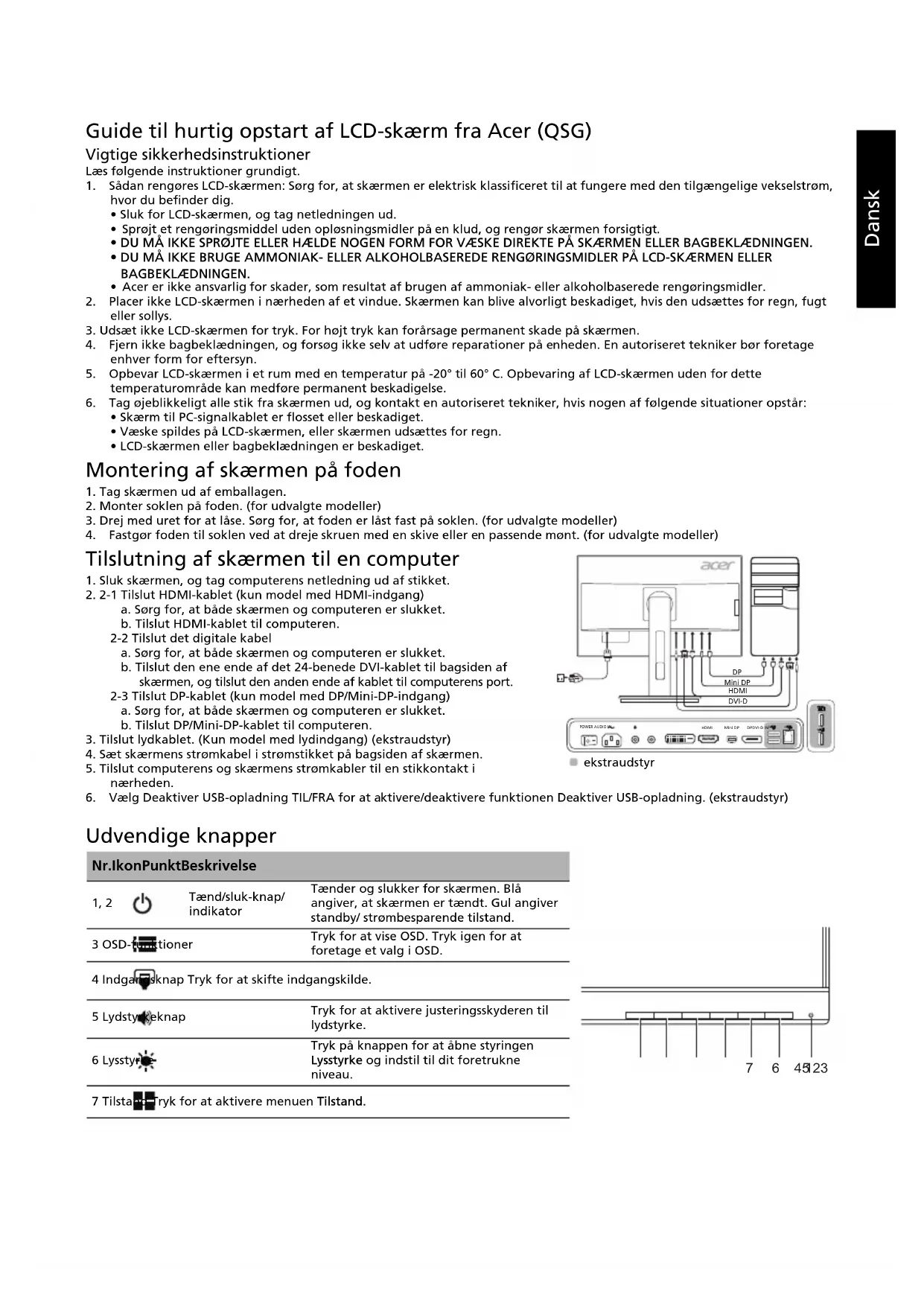 Udvendige knapper Nr. Ikon Punkt Beskrivelse 1, 2 Tænd/sluk-knap/ indikatorTænder og slukker for skærmen. Blå angiver, at skærmen er tændt. Gul angiver standby/ strømbesparende tilstand.3 OSD-funktionerTryk for at vise OSD. Tryk igen for at foretage et valg i OSD.4 Indgangsknap Tryk for at skifte indgangskilde.5 LydstyrkeknapTryk for at aktivere justeringsskyderen til lydstyrke.6 LysstyrkeTryk på knappen for at åbne styringen Lysstyrke og indstil til dit foretrukne niveau.7 Tilstand Tryk for at aktivere menuen Tilstand. HDMI DVI-DMini DP POWER AUDIO INHDMI DPDVI-D INMini DP ekstraudstyr 1234567Dansk Regler og sikkerhedsforskrifter FCC-forskrifter Denne enhed er blevet testet og fundet i overensstemmelse med grænserne for en digital enhed i klasse B i henhold til afsnit 15 i FCC-reglerne. Disse grænser er fastsat for at yde rimelig beskyttelse mod skadelig interferens i beboelsesinstallationer. Denne enhed genererer, bruger og kan udstråle radiofrekvensenergi. Hvis produktet ikke installeres og bruges i overensstemmelse med instruktionerne, kan det forårsage skadelig interferens for radiokommunikation. Der er dog ingen garanti for, at interferens ikke vil forekomme i en bestemt installation. Hvis denne enhed forårsager skadelig interferens ved radio- eller tv-modtagelse, hvilket kan fastslås ved at slukke for enheden og tænde den igen, opfordres brugeren til at forsøge at afhjælpe interferensen ved en eller flere af følgende foranstaltninger: Juster eller flyt modtagerantennen. Forøg afstanden mellem enheden og modtageren. Slut enheden til en stikkontakt på et andet kredsløb end det, modtageren er tilsluttet. Kontakt forhandleren eller en erfaren radio/tv-tekniker for at få hjælp. CE-overensstemmelseserklæring Acer Inc. erklærer herved, at denne LCD-skærm overholder de væsentlige krav og andre relevante bestemmelser i EMC-direktivet 2014/30/EU, lavspændingsdirektivet 2014/35/EU og RoHS-direktivet 2011/65/EU og direktiv 2009/125/EF om rammerne for fastlæggelse af krav til miljøvenligt design af energirelaterede produkter. Bemærk: Løft ikke skærmen i dens fod for at undgå at beskadige skærmen. Bemærk: Afskærmede kabler Alle forbindelser til andre computerenheder skal foretages med afskærmede kabler for at overholde EMC-reglerne. Bemærk: Eksterne enheder Kun eksterne enheder (indgående/udgående enheder, terminaler, printere osv.), som er certificeret i overensstemmelse med klasse B-grænserne, må tilsluttes dette udstyr. Brug af ikke-certificerede enheder forventes at medføre interferens i radio- og tv-modtagelse. Forsigtig Ændringer eller modifikationer, som ikke er udtrykkeligt godkendt af producenten, kan ugyldiggøre brugerens ret, som er ydet af FCC (Federal Communications Commission), til at bruge dette produkt. Driftsbetingelser Denne enhed overholder afsnit 15 i FCC-reglerne. Driften er underlagt følgende to betingelser: (1) denne enhed må ikke forårsage skadelig interferens, og (2) enheden skal acceptere modtaget interferens, herunder interferens, der kan forårsage uønsket drift. Bemærk: Canadiske brugere Denne digitale enhed i klasse B overholder den canadiske ICES-003. Remarque à l'intention des utilisateurs canadiens Cet appareil numérique de la classe B est conforme à la norme NMB-003 du Canada. Bortskaffelse af udstyr af brugere i private husholdninger i den Europæiske Union Dette symbol på produktet eller emballagen angiver, at dette produkt ikke må bortskaffes sammen med det øvrige husholdningsaffald. I stedet er det dit ansvar at bortskaffe udstyret ved at aflevere det på et angivet indsamlingssted for genanvendelse af elektrisk og elektronisk udstyr. Separat indsamling og genanvendelse af udstyret er med til at bevare naturlige ressourcer og sikre, at det genbruges på en måde, der beskytter menneskers sundhed og miljøet. For flere oplysninger om, hvor du kan aflevere dit udstyr til genbrug, skal du kontakte din kommune, dit renovationsselskab eller den butik, hvor du købte produktet. Advarsel om magnet Visse elektroniske enheder som harddiske, USB-enheder, tablet-computere, bærbare computere, mobiltelefoner, ure, hovedtelefoner, højttalere, kreditkort, magnetiske id-kort osv. er følsomme over for magnetiske felter og kan blive beskadiget permanent eller midlertidigt deaktiveret, hvis de udsættes for et magnetisk felt, der er for stærkt. Elektroniske enheder må ikke anbringes tæt ved eller direkte på det magnetiske felt på skærmens fod. MagnetDansk SPECIFIKATIONER Find vejledninger og andre dokumenter til dit Acer-produkt på Acers officielle support-websted. *Årligt energiforbrug er beregnet på baggrund af det typiske strømforbrug i 4 timer om dagen, 365 dage om året. LCD-panel Driversystem TFT farve-LCD Størrelse 27”W (69 cm) Pixelafstand 0,155 mm (H) x 0,155 mm (V) Lysstyrke 350 cd/m