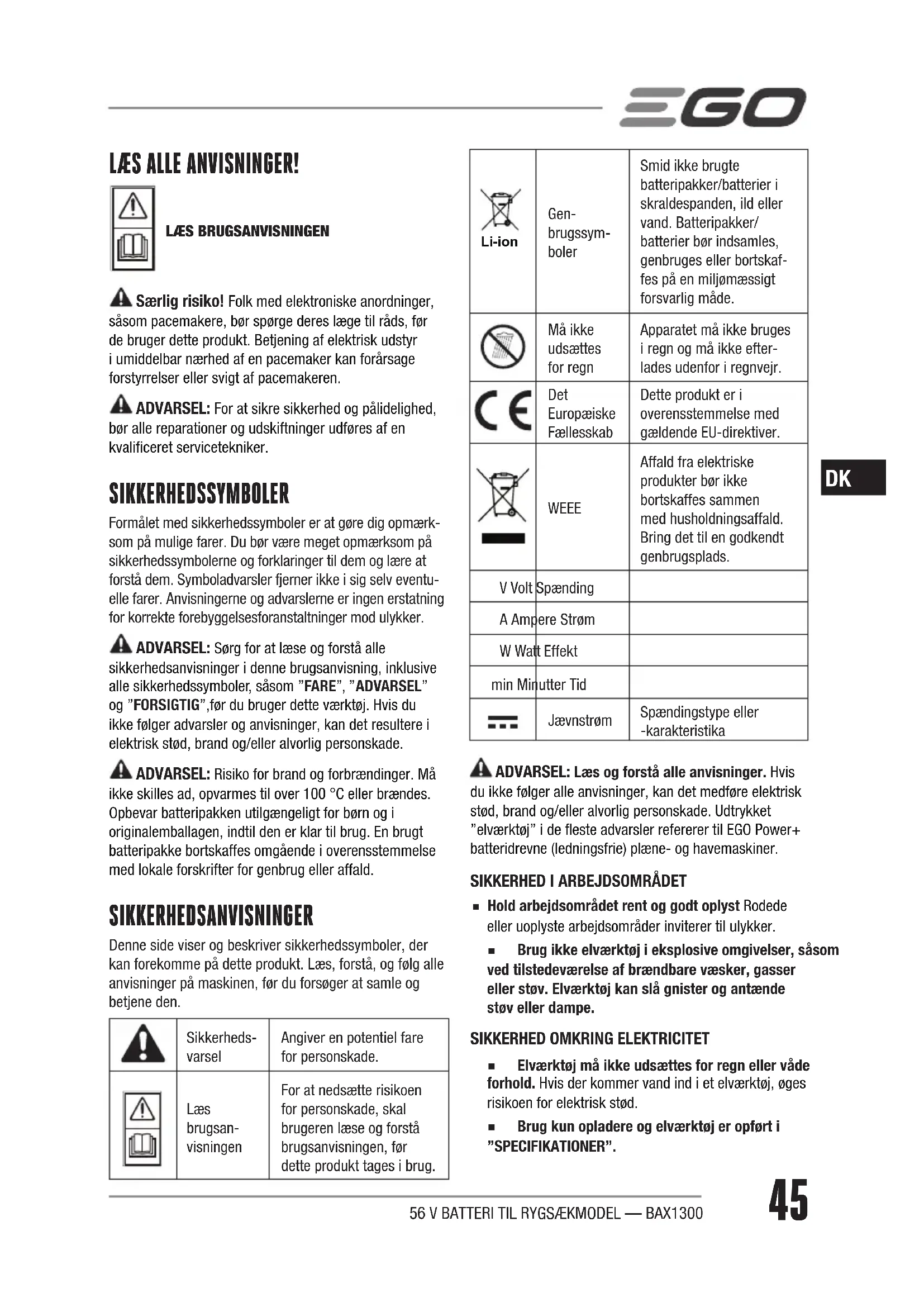 Særlig risiko! Folk med elektroniske anordninger, såsom pacemakere, bør spørge deres læge til råds, før de bruger dette produkt. Betjening af elektrisk udstyr i umiddelbar nærhed af en pacemaker kan forårsage forstyrrelser eller svigt af pacemakeren. ADVARSEL: For at sikre sikkerhed og pålidelighed, bør alle reparationer og udskiftninger udføres af en kvaliceret servicetekniker. SIKKERHEDSSYMBOLER Formålet med sikkerhedssymboler er at gøre dig opmærk-som på mulige farer. Du bør være meget opmærksom på sikkerhedssymbolerne og forklaringer til dem og lære at forstå dem. Symboladvarsler fjerner ikke i sig selv eventu-elle farer. Anvisningerne og advarslerne er ingen erstatning for korrekte forebyggelsesforanstaltninger mod ulykker. ADVARSEL: Sørg for at læse og forstå alle sikkerhedsanvisninger i denne brugsanvisning, inklusive alle sikkerhedssymboler, såsom ”FARE”, ”ADVARSEL” og ”FORSIGTIG”,før du bruger dette værktøj. Hvis du ikke følger advarsler og anvisninger, kan det resultere i elektrisk stød, brand og/eller alvorlig personskade. ADVARSEL: Risiko for brand og forbrændinger. Må ikke skilles ad, opvarmes til over 100 °C eller brændes. Opbevar batteripakken utilgængeligt for børn og i originalemballagen, indtil den er klar til brug. En brugt batteripakke bortskaffes omgående i overensstemmelse med lokale forskrifter for genbrug eller affald. SIKKERHEDSANVISNINGER Denne side viser og beskriver sikkerhedssymboler, der kan forekomme på dette produkt. Læs, forstå, og følg alle anvisninger på maskinen, før du forsøger at samle og betjene den.Sikkerheds-varselAngiver en potentiel fare for personskade. Læs brugsan-visningenFor at nedsætte risikoen for personskade, skal brugeren læse og forstå brugsanvisningen, før dette produkt tages i brug.Li-ion Gen- brugssym-bolerSmid ikke brugte batteripakker/batterier i skraldespanden, ild eller vand. Batteripakker/batterier bør indsamles, genbruges eller bortskaf-fes på en miljømæssigt forsvarlig måde.Må ikke udsættes for regnApparatet må ikke bruges i regn og må ikke efter-lades udenfor i regnvejr. Det Europæiske FællesskabDette produkt er i overensstemmelse med gældende EU-direktiver.WEEE Affald fra elektriske produkter bør ikke bortskaffes sammen med husholdningsaffald. Bring det til en godkendt genbrugsplads.V Volt SpændingA Ampere StrømW Watt Effektmin Minutter TidJævnstrømSpændingstype eller -karakteristika ADVARSEL: Læs og forstå alle anvisninger. Hvis du ikke følger alle anvisninger, kan det medføre elektrisk stød, brand og/eller alvorlig personskade. Udtrykket ”elværktøj” i de este advarsler refererer til EGO Power+ batteridrevne (ledningsfrie) plæne- og havemaskiner.
