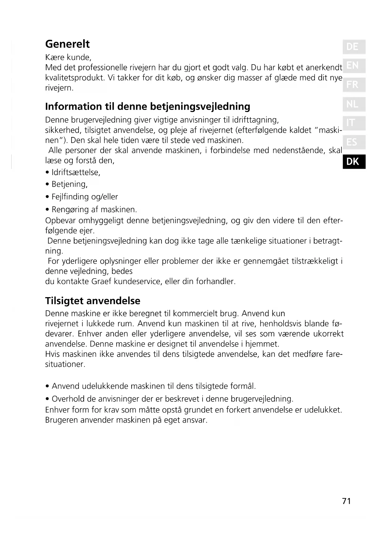- Rengøring af maskinen. Opbevar omhyggeligt denne betjeningsvejledning, og giv den videre til den efter- følgende ejer. Denne betjeningsvejledning kan dog ikke tage alle tænkelige situationer i betragt- ning. For yderligere oplysninger eller problemer der ikke er gennemgået tilstrækkeligt i denne vejledning, bedes du kontakte Graef kundeservice, eller din forhandler. Tilsigtet anvendelse Denne maskine er ikke beregnet til kommercielt brug. Anvend kun rivejernet i lukkede rum. Anvend kun maskinen til at rive, henholdsvis blande fø- devarer. Enhver anden eller yderligere anvendelse, vil ses som værende ukorrekt anvendelse. Denne maskine er designet til anvendelse i hjemmet. Hvis maskinen ikke anvendes til dens tilsigtede anvendelse, kan det medføre fare- situationer.