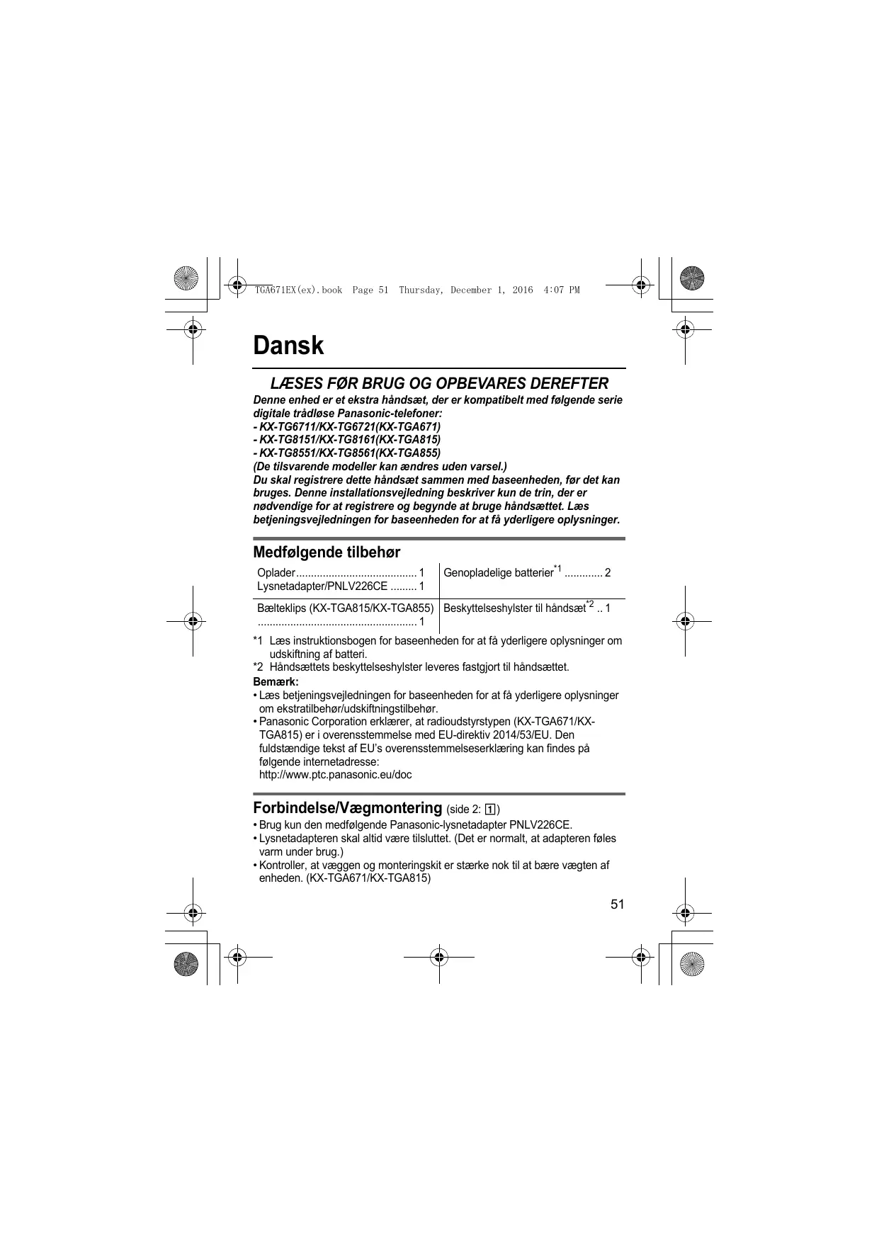 - TGA671EX(ex).book Page 51 Thursday, December 1, 2016 4:07 PM Dansk LÆSES FØR BRUG OG OPBEVARES DEREFTER Denne enhed er et ekstra håndsæt, der er kompatibelt med følgende serie digitale trådløse Panasonic-telefoner: - KX-TG6711/KX-TG6721(KX-TGA671) - KX-TG8151/KX-TG8161(KX-TGA815) - KX-TG8551/KX-TG8561(KX-TGA855) (De tilsvarende modeller kan ændres uden varsel.) Du skal registrere dette håndsæt sammen med baseenheden, før det kan bruges. Denne installationsvejledning beskriver kun de trin, der er nødvendige for at registrere og begynde at bruge håndsættet. Læs betjeningsvejledningen for baseenheden for at få yderligere oplysninger. Medfølgende tilbehør Oplader p. 1