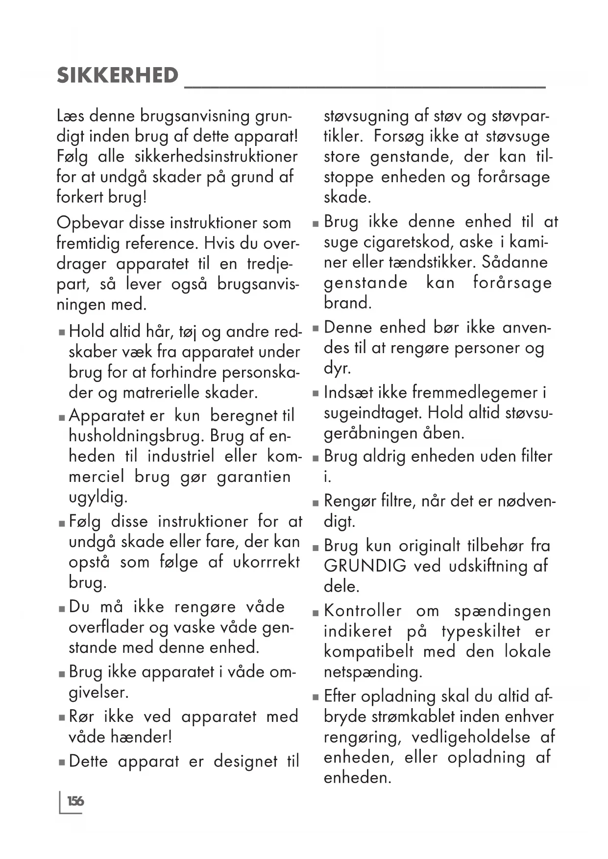 Dette apparat er designet til støvsugning af støv og støvpar- tikler. Forsøg ikke at støvsuge store genstande, der kan til- stoppe enheden og forårsage skade.