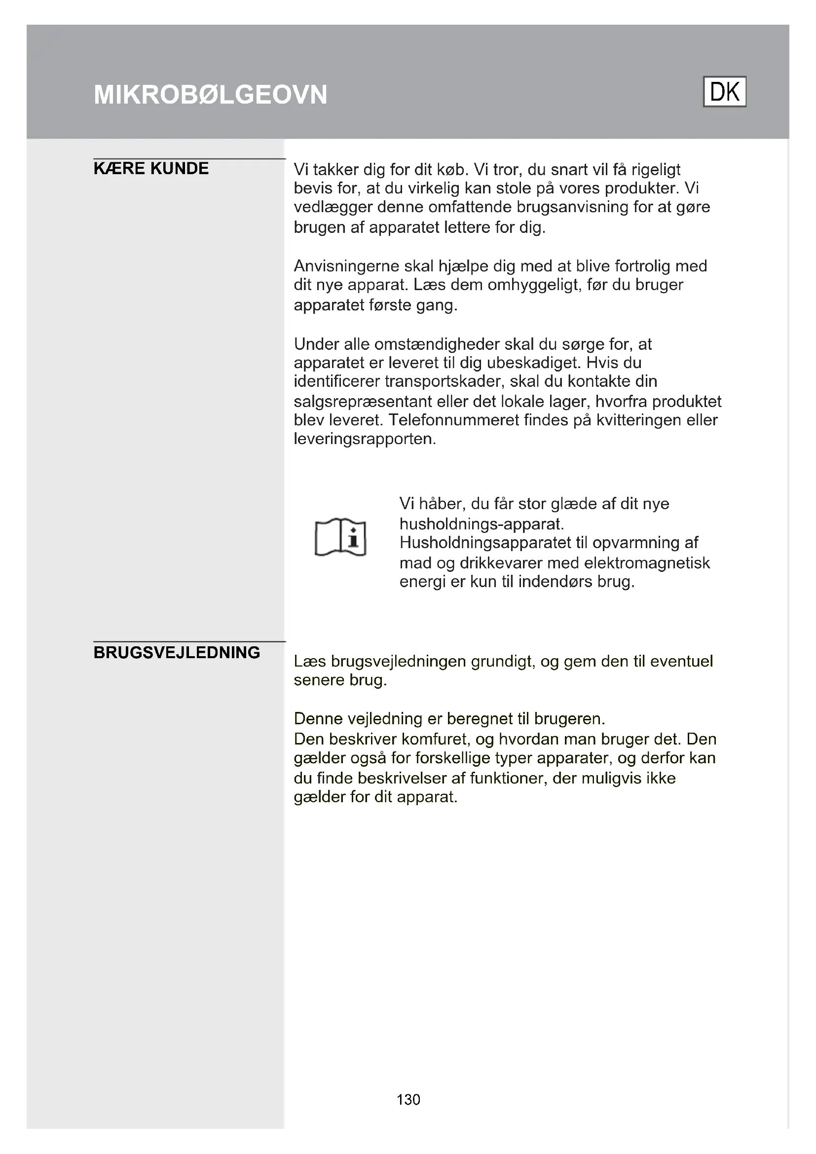 Vi takker dig for dit køb. Vi tror, du snart vil få rigeligt bevis for, at du virkelig kan stole på vores produkter. Vi vedlægger denne omfattende brugsanvisning for at gøre brugen af apparatet lettere for dig. Anvisningerne skal hjælpe dig med at blive fortrolig med dit nye apparat. Læs dem omhyggeligt, før du bruger apparatet første gang. Under alle omstændigheder skal du sørge for, at apparatet er leveret til dig ubeskadiget. Hvis du identificerer transportskader, skal du kontakte din salgsrepræsentant eller det lokale lager, hvorfra produktet blev leveret. Telefonnummeret findes på kvitteringen eller leveringsrapporten. Vi håber, du får stor glæde af dit nye husholdnings-apparat. Husholdningsapparatet til opvarmning af mad og drikkevarer med elektromagnetisk energi er kun til indendørs brug. BRUGSVEJLEDNING Læs brugsvejledningen grundigt, og gem den til eventuel senere brug. Denne vejledning er beregnet til brugeren. Den beskriver komfuret, og hvordan man bruger det. Den gælder også for forskellige typer apparater, og derfor kan du finde beskrivelser af funktioner, der muligvis ikke gælder for dit apparat.