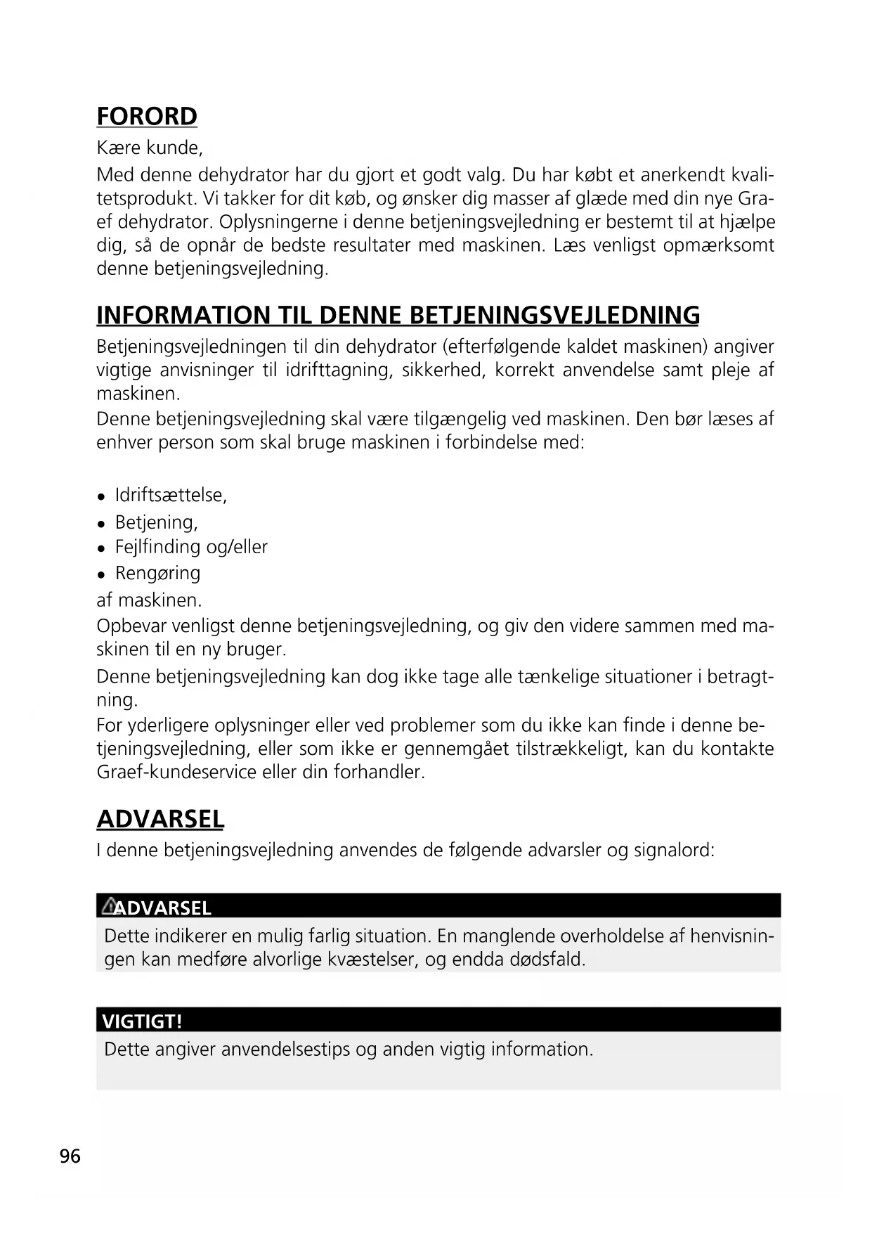 Betjeningsvejledningen til din dehydrator (efterfølgende kaldet maskinen) angiver vigtige anvisninger til idrifttagning, sikkerhed, korrekt anvendelse samt pleje af maskinen. Denne betjeningsvejledning skal være tilgængelig ved maskinen. Den bør læses af enhver person som skal bruge maskinen i forbindelse med: ● Idriftsættelse, ● Betjening, ● Fejlnding og/eller ● Rengøring af maskinen. Opbevar venligst denne betjeningsvejledning, og giv den videre sammen med ma- skinen til en ny bruger. Denne betjeningsvejledning kan dog ikke tage alle tænkelige situationer i betragt- ning. For yderligere oplysninger eller ved problemer som du ikke kan nde i denne be- tjeningsvejledning, eller som ikke er gennemgået tilstrækkeligt, kan du kontakte Graef-kundeservice eller din forhandler. ADVARSEL I denne betjeningsvejledning anvendes de følgende advarsler og signalord: ADVARSEL Dette indikerer en mulig farlig situation. En manglende overholdelse af henvisnin- gen kan medføre alvorlige kvæstelser, og endda dødsfald. VIGTIGT! Dette angiver anvendelsestips og anden vigtig information.97