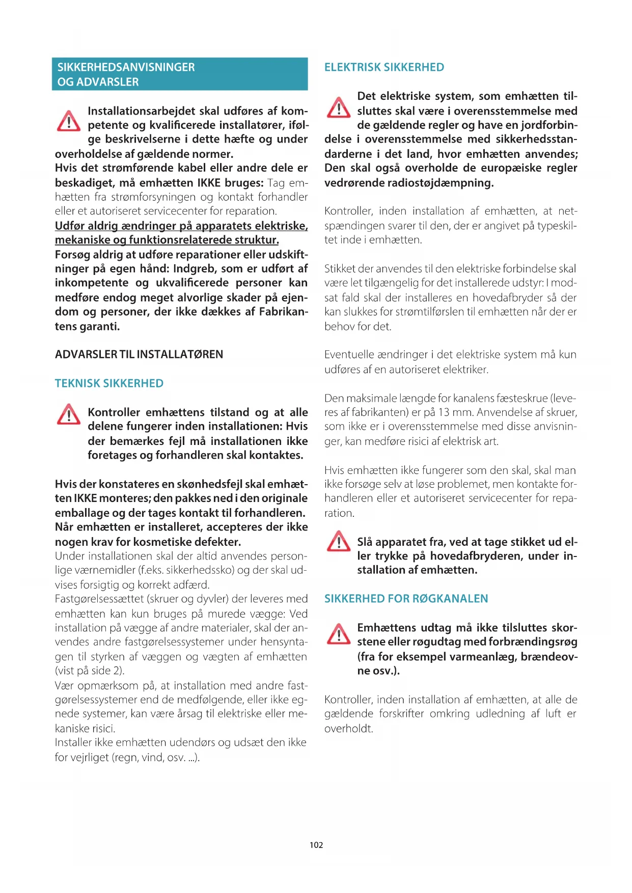 Emhættens udtag må ikke tilsluttes skor- stene eller røgudtag med forbrændingsrøg (fra for eksempel varmeanlæg, brændeov- ne osv.). Kontroller, inden installation af emhætten, at alle de gældende forskrifter omkring udledning af luft er overholdt.103 DANSK