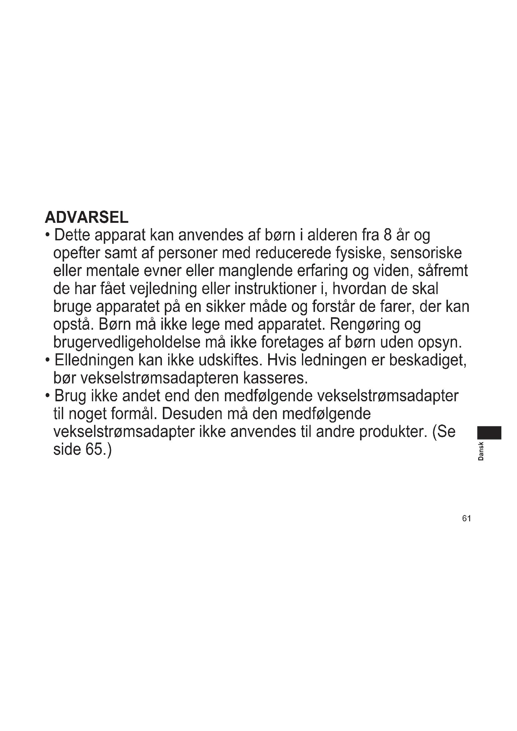 - Dette apparat kan anvendes af børn i alderen fra 8 år og opefter samt af personer med reducerede fysiske, sensoriske eller mentale evner eller manglende erfaring og viden, såfremt de har fået vejledning eller instruktioner i, hvordan de skal bruge apparatet på en sikker måde og forstår de farer, der kan opstå. Børn må ikke lege med apparatet. Rengøring og brugervedligeholdelse må ikke foretages af børn uden opsyn.