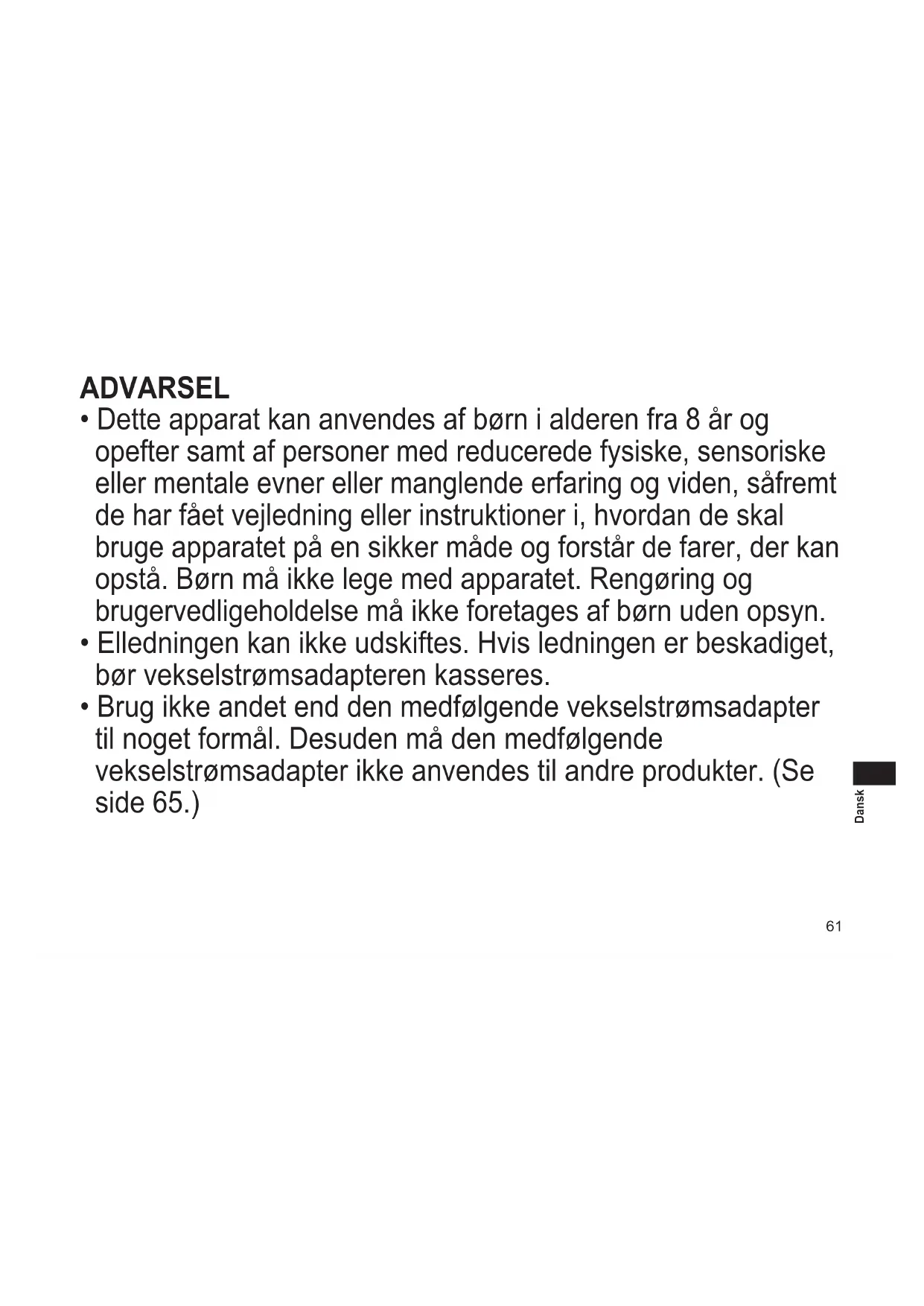 - Brug ikke andet end den medfølgende vekselstrømsadapter til noget formål. Desuden må den medfølgende vekselstrømsadapter ikke anvendes til andre produkter. (Se side 65.)62 Dansk