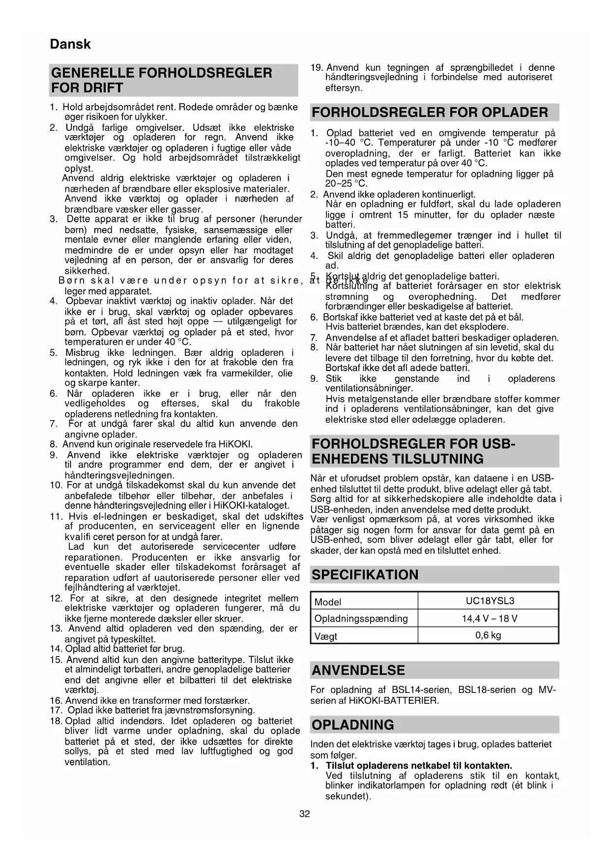 ENHEDENS TILSLUTNING Når et uforudset problem opstår, kan dataene i en USB- enhed tilsluttet til dette produkt, blive ødelagt eller gå tabt. Sørg altid for at sikkerhedskopiere alle indeholdte data i USB-enheden, inden anvendelse med dette produkt. Vær venligst opmærksom på, at vores virksomhed ikke påtager sig nogen form for ansvar for data gemt på en USB-enhed, som bliver ødelagt eller går tabt, eller for skader, der kan opstå med en tilsluttet enhed. SPECIFIKATION Model UC18YSL3 Opladningsspænding 14,4 V – 18 V Vægt 0,6 kg ANVENDELSE For opladning af BSL14-serien, BSL18-serien og MV- serien af HiKOKI-BATTERIER. OPLADNING Inden det elektriske værktøj tages i brug, oplades batteriet som følger.