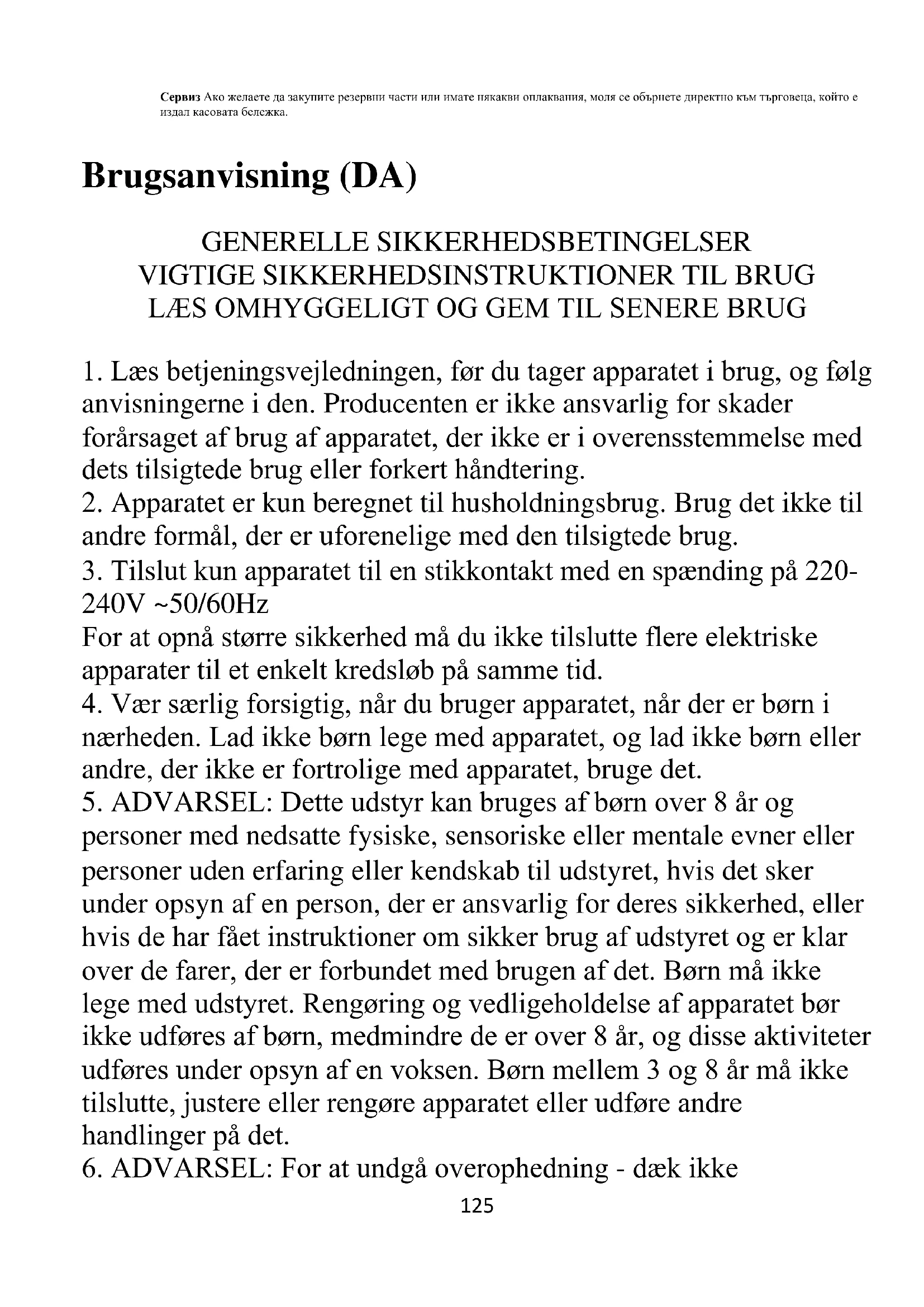 Af hensyn til miljoet. Papemballage og polyctheny (PE)-poscr skal bortskaffes i de relevante containere til separat indsamling af communalt affald i henhold til deres beskrivelse. Hvis der er batterier i apparatet, skal de tages ud og bortskaffes separat pa et indsamlingsog opbevaringssted. Det brugte apparat skal aflveres pa et egnet indsamlings- og opbevaringssted, da de farlige stoffer, det indeholder, kan udgore en risiko for sundhed og miljo. Markningen pa Produktet angiver, at apparatet ikke ma bortskaffes i den communale affaldscontainer. Kasseret elektrisk udstyr er affald, der indeholder stoffer, som er skadelige for mennesker, dyr og miljo. Disse stoffer kan forurene jord, vand ell er luft, og derigenennem de trange nd i mensesekroppen og fore til en rakte helbredsproblemer, sasom nedsat syn, horelse, tale, kan ogsa skade nyre, lever og hjerte og forarsage hudsygdomme. Skadelige stoffer kan ogsa have negative virkninger pa andedrets- og forplantningssystemet og frcrflorandringer. Indtagelse af planter, der vokser pa dc berorte jorde, ogprodukter, der cr fremstillet af dem, kan resultere i de ovennveinte helbredseffeker. Smid ilke udstyret i den communale affaldsspand! Service Hvis du onsker at kobe rescvcdele cher har nogen klager, bedes du kontakte den forhandler, der har udstedt kvitteringen direkte.