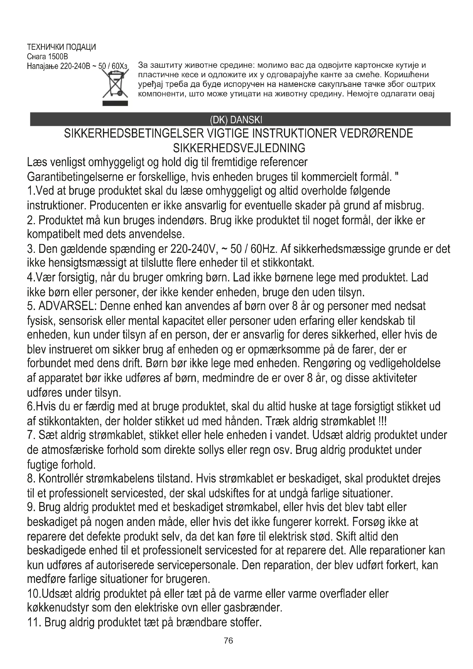 fysisk, sensorisk eller mental kapacitet eller personer uden erfaring eller kendskab til enheden, kun under tilsyn af en person, der er ansvarlig for deres sikkerhed, eller hvis de blev instrueret om sikker brug af enheden og er opmærksomme på de farer, der er forbundet med dens drift. Børn bør ikke lege med enheden. Rengøring og vedligeholdelse af apparatet bør ikke udføres af børn, medmindre de er over 8 år, og disse aktiviteter udføres under tilsyn. 6.Hvis du er færdig med at bruge produktet, skal du altid huske at tage forsigtigt stikket ud af stikkontakten, der holder stikket ud med hånden. Træk aldrig strømkablet !!!
