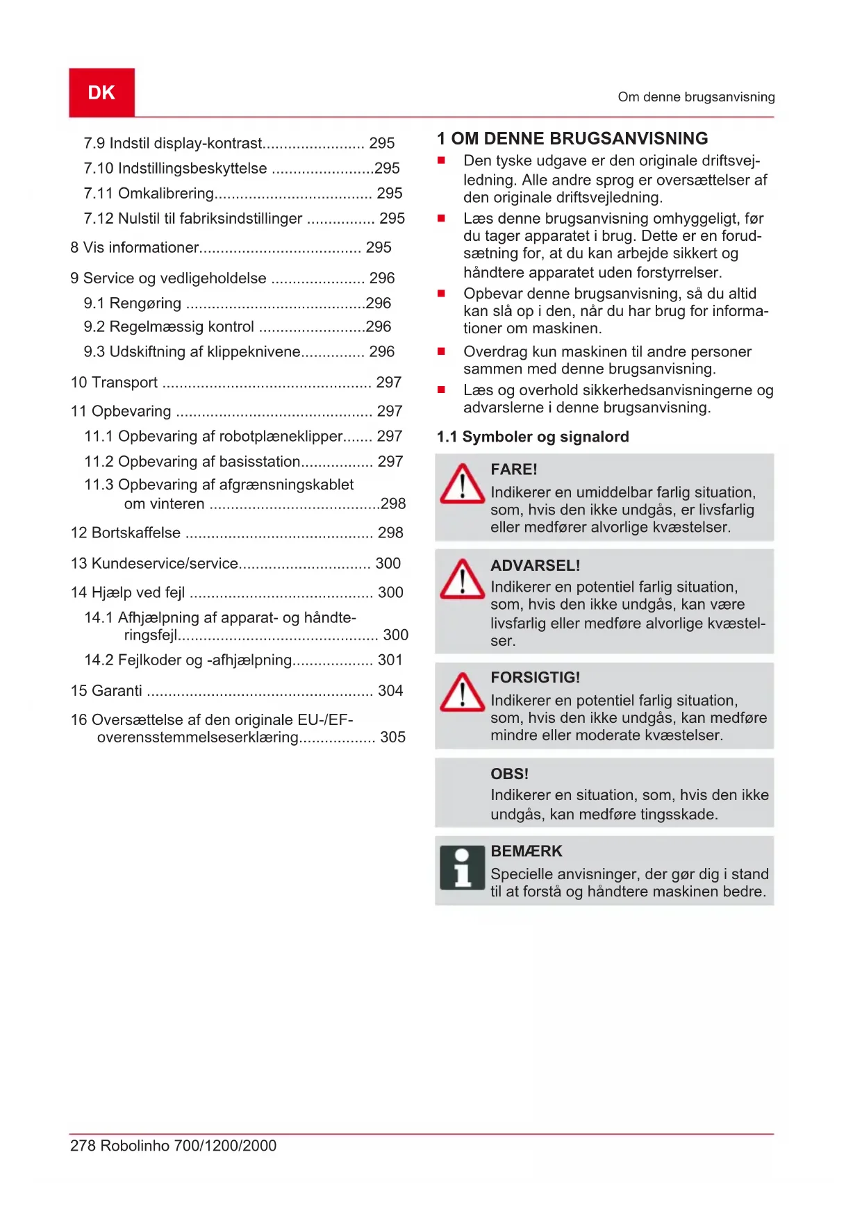 FARE! Indikerer en umiddelbar farlig situation, som, hvis den ikke undgås, er livsfarlig eller medfører alvorlige kvæstelser. ADVARSEL! Indikerer en potentiel farlig situation, som, hvis den ikke undgås, kan være livsfarlig eller medføre alvorlige kvæstel- ser. FORSIGTIG! Indikerer en potentiel farlig situation, som, hvis den ikke undgås, kan medføre mindre eller moderate kvæstelser. OBS! Indikerer en situation, som, hvis den ikke undgås, kan medføre tingsskade. BEMÆRK Specielle anvisninger, der gør dig i stand til at forstå og håndtere maskinen bedre.457825_a 279 Produktbeskrivelse 2 PRODUKTBESKRIVELSE Denne dokumentation beskriver en fuldautoma- tisk, batteridreven robotplæneklipper, som bevæ- ger sig frit på en græsplæne. Klippehøjden kan indstilles.