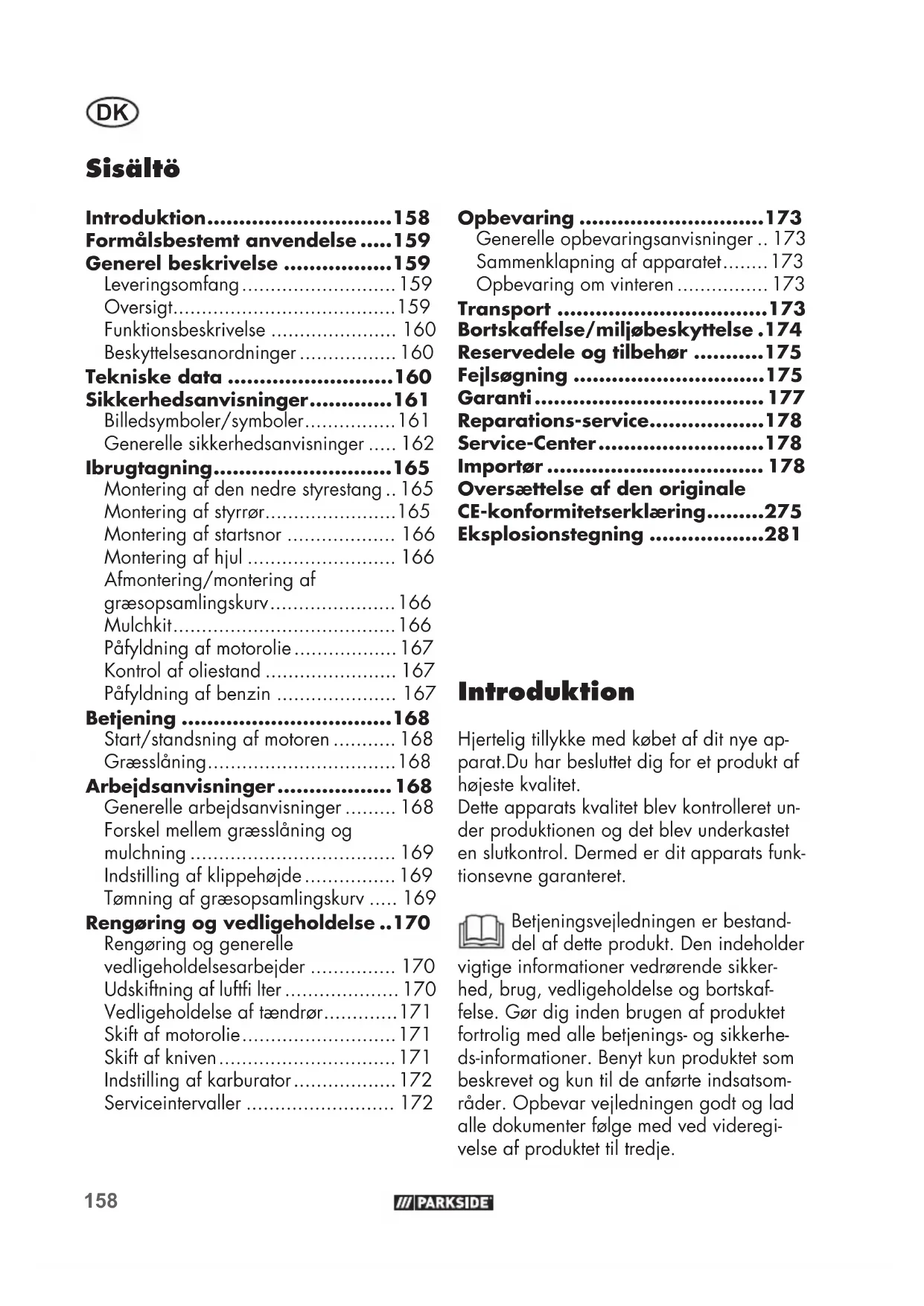 - Eksplosionstegning Introduktion Hjertelig tillykke med købet af dit nye ap- parat.Du har besluttet dig for et produkt af højeste kvalitet. Dette apparats kvalitet blev kontrolleret un- der produktionen og det blev underkastet en slutkontrol. Dermed er dit apparats funk- tionsevne garanteret. Betjeningsvejledningen er bestand- del af dette produkt. Den indeholder vigtige informationer vedrørende sikker- hed, brug, vedligeholdelse og bortskaf- felse. Gør dig inden brugen af produktet fortrolig med alle betjenings- og sikkerhe- ds-informationer. Benyt kun produktet som beskrevet og kun til de anførte indsatsom- råder. Opbevar vejledningen godt og lad alle dokumenter følge med ved videregi- velse af produktet til tredje.159 p. 281
