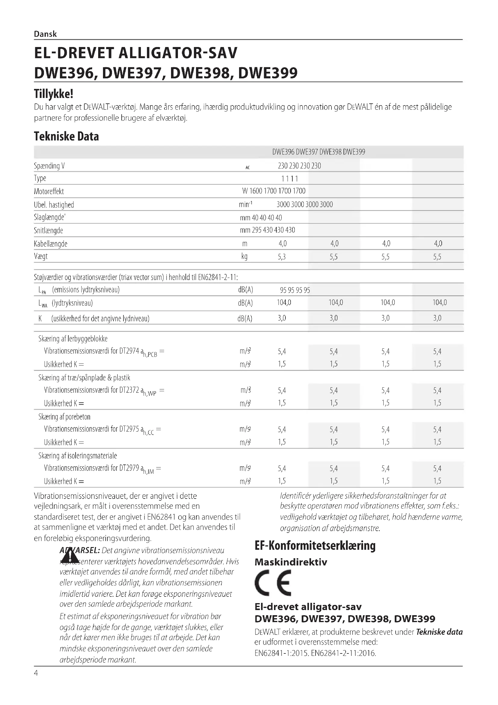 DeWALT erklærer, at produkterne beskrevet under Tekniske data er udformet i overensstemmelse med: EN62841-1:2015. EN62841-2-11:2016. Vibrationsemissionsniveauet, der er angivet i dette vejledningsark, er målt i overensstemmelse med en standardiseret test, der er angivet i EN62841 og kan anvendes til at sammenligne et værktøj med et andet. Det kan anvendes til en foreløbigeksponeringsvurdering.