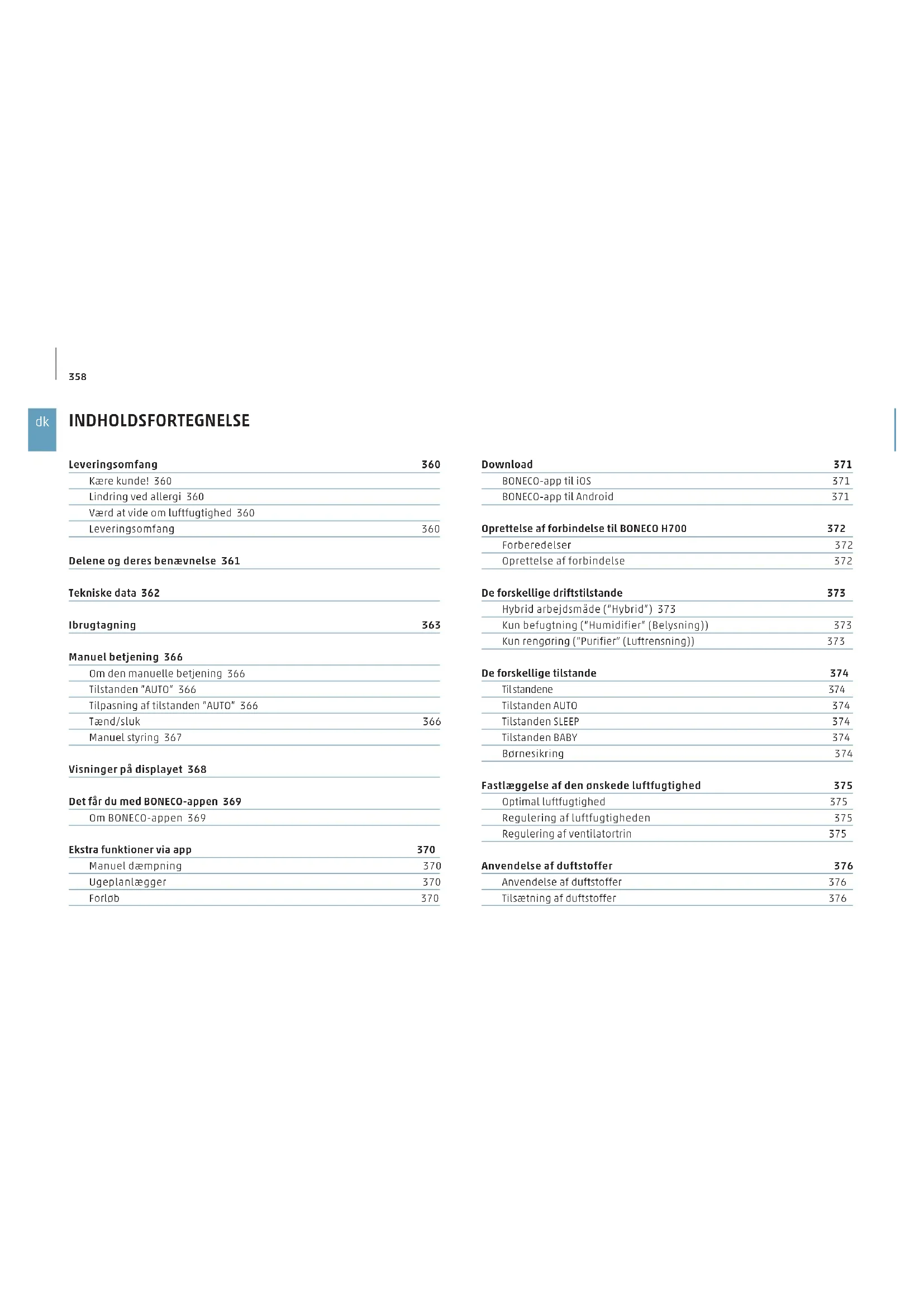 INDHOLDSFORTEGNELSE Leveringsomfang 360 Kære kunde! 360 Lindring ved allergi 360 Værd at vide om luftfugtighed 360 Leveringsomfang 360 Delene og deres benævnelse 361 Tekniske data 362 Ibrugtagning 363 Manuel betjening 366 Om den manuelle betjening 366 Tilstanden ”AUTO” 366 Tilpasning af tilstanden ”AUTO” 366 Tænd/sluk 366 Manuel styring 367 Visninger på displayet 368 Det får du med BONECO-appen 369 Om BONECO-appen 369 Ekstra funktioner via app 370 Manuel dæmpning 370 Ugeplanlægger 370 Forløb 370 Download 371 BONECO-app til iOS 371 BONECO-app til Android 371 Oprettelse af forbindelse til BONECO H700 372 Forberedelser 372 Oprettelse af forbindelse 372 De forskellige driftstilstande 373 Hybrid arbejdsmåde (”Hybrid”) 373 Kun befugtning (”Humidifier” (Belysning)) 373 Kun rengøring (”Purifier” (Luftrensning)) 373 De forskellige tilstande 374 Tilstandene 374 Tilstanden AUTO 374 Tilstanden SLEEP 374 Tilstanden BABY 374 Børnesikring 374 Fastlæggelse af den ønskede luftfugtighed 375 Optimal luftfugtighed 375 Regulering af luftfugtigheden 375 Regulering af ventilatortrin 375 Anvendelse af duftstoffer 376 Anvendelse af duftstoffer 376 Tilsætning af duftstoffer 376359
