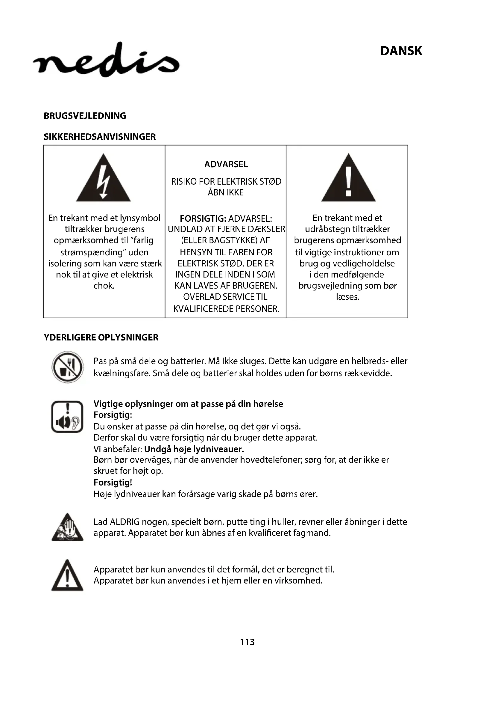 KVALIFICEREDE PERSONER. En trekant med et udråbstegn tiltrækker brugerens opmærksomhed til vigtige instruktioner om brug og vedligeholdelse i den medfølgende brugsvejledning som bør læses. YDERLIGERE OPLYSNINGER Pas på små dele og batterier. Må ikke sluges. Dette kan udgøre en helbreds- eller kvælningsfare. Små dele og batterier skal holdes uden for børns rækkevidde. Vigtige oplysninger om at passe på din hørelse Forsigtig: Du ønsker at passe på din hørelse, og det gør vi også. Derfor skal du være forsigtig når du bruger dette apparat. Vi anbefaler: Undgå høje lydniveauer. Børn bør overvåges, når de anvender hovedtelefoner; sørg for, at der ikke er skruet for højt op. Forsigtig! Høje lydniveauer kan forårsage varig skade på børns ører. Lad ALDRIG nogen, specielt børn, putte ting i huller, revner eller åbninger i dette apparat. Apparatet bør kun åbnes af en kvaliceret fagmand. Apparatet bør kun anvendes til det formål, det er beregnet til. Apparatet bør kun anvendes i et hjem eller en virksomhed.114 DANSK Gem denne vejledning, så du kan slå op i den senere. Vejledning i miljøbeskyttelse Dette produkt må ikke bortskaes med det almindelige husholdningsaald, når det engang er slidt op; bring apparatet til en indsamlingsordning for kasseret elektrisk og elektronisk udstyr. Symbolet på produktet, brugsvejledningen eller indpakningen giver oplysninger om korrekt bortskaelse. Materialerne er genanvendelige, som angivet på mærkatet. Ved at bringe produktet til genanvendelse er du med til at sikre, at apparatet eller dets komponenter genanvendes og gør dermed en vigtig indsats til beskyttelse af miljøet. Spørg hos din kommune, hvordan indsamling af sådanne produkter foregår i netop din kommune. Undlad at blokere apparatets ventilationsåbninger. Sørg for, at ingen gardiner, aviser, møbler eller andre genstande blokerer apparatets ventilationsåbninger. Ventilationssystemet skal til enhver tid være fri for enhver tildækning! Overophedning kan medføre stor skade på apparatet og have negativ indydelse på dets ydeevne og levetid. Varme Undlad at udsætte apparatet for direkte sollys. Sørg for, at apparatet ikke udsættes for varme fra direkte varmekilder som f.eks. varmeapparater eller åben ild. Sørg for, at apparatets ventilationsåbninger ikke tildækkes. Fugt og rengøring Dette apparat er ikke vandtæt! Må ikke nedsænkes i vand. Lad ikke radioen komme i kontakt med vand. Hvis der trænger vand ind i radioen, kan det medføre alvorlig skade. Brug ikke rengøringsmidler indeholdende alkohol, ammoniak, rensebenzin eller slibemidler, da sådanne midler kan beskadige radioen. Anvend en blød, let fugtet klud til rengøringen. Professionelt genbrug Batterier og indpakning må ikke smides i skraldespanden. Batterier skal indleveres et sted hvor de indsamler brugte batterier. Hjælp miljøet ved at opdele og bortskae indpakningsmaterialerne efter type. VIGTIGE SIKKERHEDSANVISNINGER For at få det bedste ud af dette apparat læs brugsvejledningen inden det tages i brug så der ikke opstår problemer i mange år.