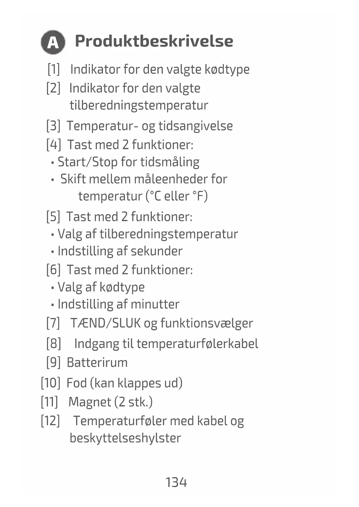Tilsigtet anvendelse Dette stegetermometer er beregnet til måling aftemperaturen/tilberedningsgradernefor fødevarervedstegning. Andre anvendelsesmuligheder: Termometerfunktionforvarme/koldedrikke-og madvarer(suppe,babymad,grillmadetc.) Termometeret er ikke beregnet til måling af kropstemperatur. Producenten eller forhand- leren påtager sig intet ansvar for skader, der er opstået på grund af forkert brug eller brug, der er i strid med det tilsigtede.