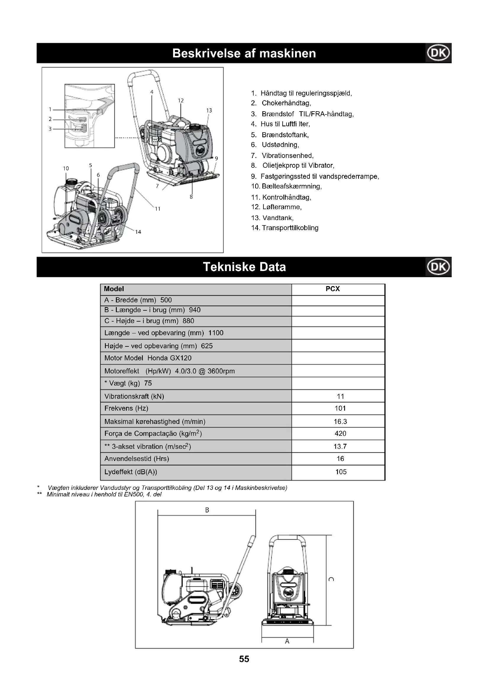 Model PCX 20A A - Bredde (mm) 500 B - Længde – i brug (mm) 940 C - Højde – i brug (mm) 880 Længde – ved opbevaring (mm) 1100 Højde – ved opbevaring (mm) 625 Motor Model Honda GX120 Motoreffekt (Hp/kW) 4.0/3.0 @ 3600rpm