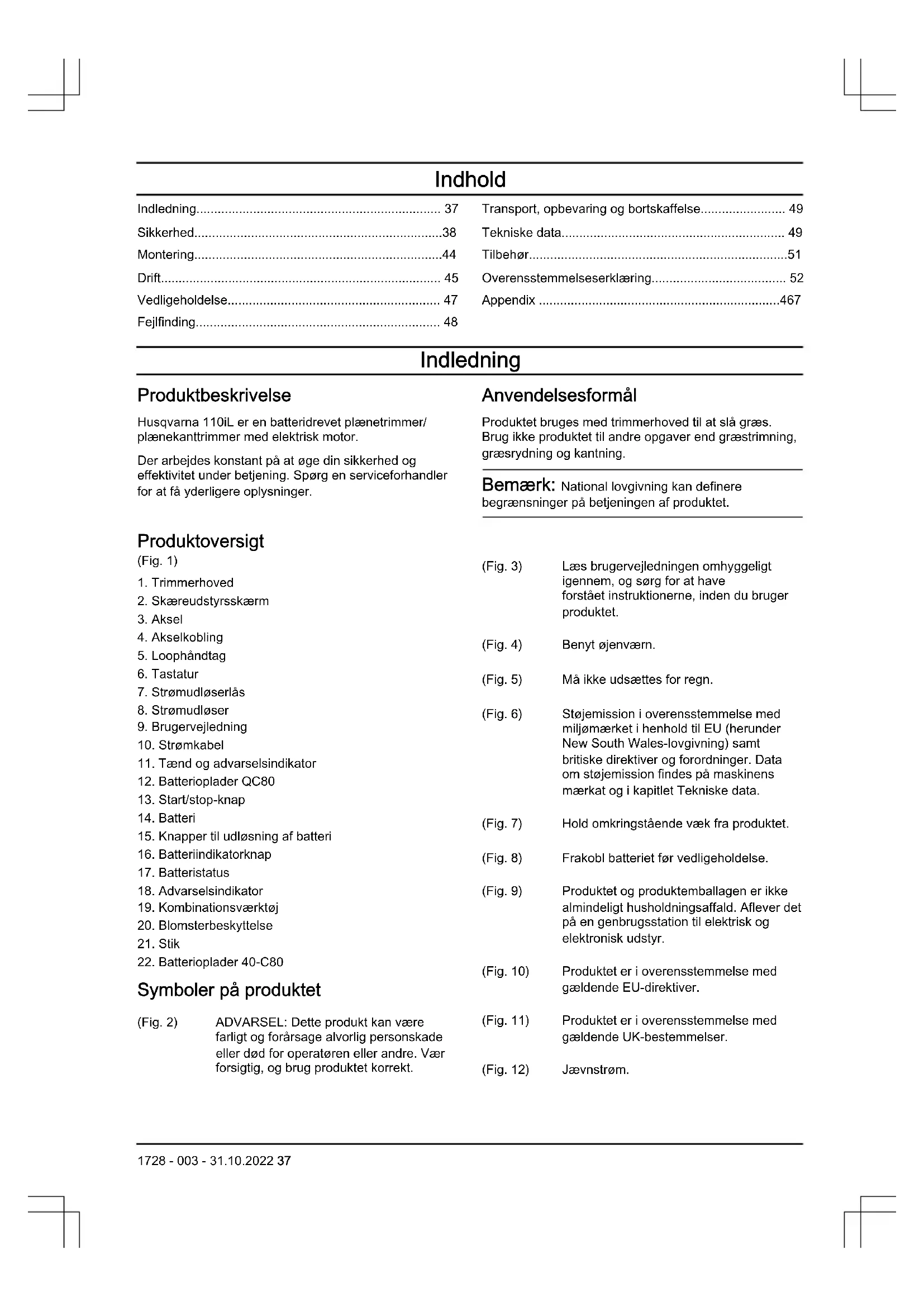 50 1728 - 003 - 31.10.2022Batterioplader QC80 40-C80 Udgangsspænding, V (jævnstrøm)/ ampere, A 36/2 43/1,6 Tilbehør Godkendt tilbehør Godkendt tilbehør Type Skæreudstyrsskærm, vare-nr. Trimmerhoved A15B M5 (Ø 1,6 mm line) 534 98 40-01 1728 - 003 - 31.10.2022 51Overensstemmelseserklæring EU-overensstemmelseserklæring Vi, Husqvarna AB, SE‐561 82 Huskvarna, Sverige, tlf.: +46-36-146500 erklærer under eneansvar, at det pågældende produkt: Beskrivelse Batteridrevet plænetrimmer/plænekanttrimmer Varemærke Husqvarna Type / model 110iL Identifikation Serienumrene fra 2022 og fremefter overholder følgende EU-direktiver og bestemmelser: Direktiv/bestemmel- ser Beskrivelse 2006/42/EF ”vedrørende maskiner" 2014/30/EU "vedrørende elektromagnetisk kompatibilitet" 2000/14/EF "vedrørende støjemissioner til omgivelserne" 2011/65/EU "om begrænsning af anvendelsen af visse farlige stoffer i elektrisk og elektronisk udstyr" og at følgende standarder og/eller tekniske specifikationer anvendes: EN 60335-1:2012+A11:2014+A13:2017+A14:2019+A1:2019 +A2:2019, EN 50636-2-91:2014, EN IEC 63000:2018, EN 55014-1:2017+A11; EN 55014-2:2015. Udpeget organ: 0197 TÜV Rheinland LGA Products GmbH, Tillystraße 2, 90431 Nürnberg, Germany har bekræftet, at bestemmelserne i Rådets direktiv 2000/14/EF, procedure for overensstemmelsesvurdering: Bilag VI. Vedr. oplysninger om støjemission, se Tekniske data på side 49