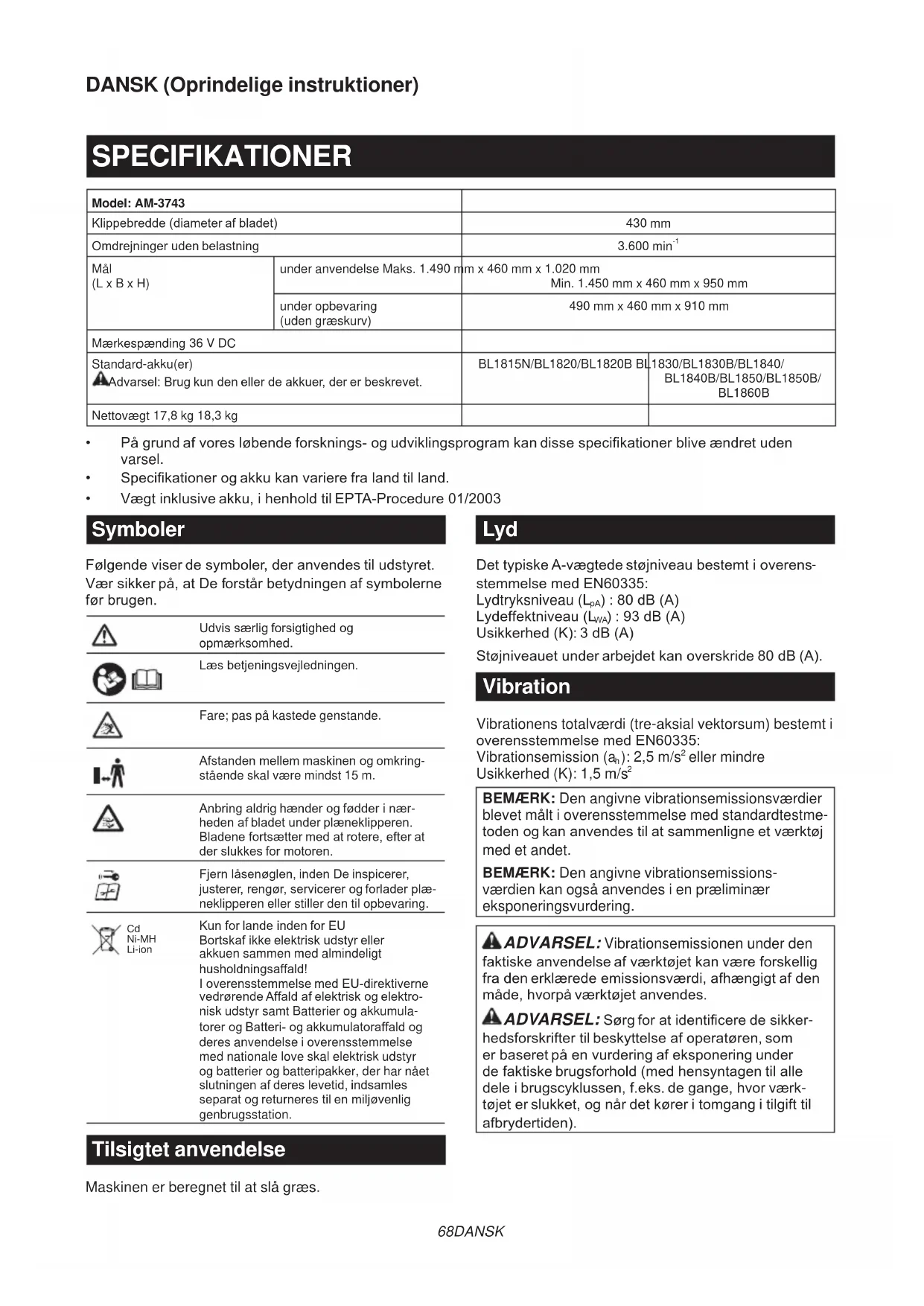 BEMÆRK: Den angivne vibrationsemissionsværdier blevet målt i overensstemmelse med standardtestme- todenogkananvendestilatsammenligneetværktøj med et andet. BEMÆRK: Den angivne vibrationsemissions- værdien kan også anvendes i en præliminær eksponeringsvurdering. ADVARSEL: Vibrationsemissionen under den faktiskeanvendelseafværktøjetkanværeforskellig fradenerklæredeemissionsværdi,afhængigtafden måde,hvorpåværktøjetanvendes. ADVARSEL:Sørgforatidenticeredesikker- hedsforskriftertilbeskyttelseafoperatøren,som erbaseretpåenvurderingafeksponeringunder defaktiskebrugsforhold(medhensyntagentilalle deleibrugscyklussen,f.eks.degange,hvorværk- tøjeterslukket,ognårdetkøreritomgangitilgifttil afbrydertiden).69 DANSK EU-konformitetserklæring Kun for lande i Europa Makitaerklærer,atdenfølgendemaskine(maskiner): Maskinensbetegnelse:Akku-plæneklipper Modelnr./Type:AM-3743 OpfylderbetingelserneidefølgendeEU-direktiver: 2000/14/EC,2006/42/EC Deerfremstilletioverensstemmelsemeddenfølgende standardellerstandardiserededokumenter:EN60335 Dentekniskel,somerioverensstemmelsemed 2006/42/EUertilgængeligfra: Makita, Jan-Baptist Vinkstraat 2, 3070, Belgien Denprocedureforkonformitetsfastsættelse,som krævesiDirektiv2000/14/EU,erfundetioverensstem- melse med tillæg VI. Noticeretorganisation:TÜVRheinlandLGAProducts GmbH AmGrauenStein29,51105Köln,Tyskland Identikationsnummer0197 Måltlydbelastningsniveau:93dB(A) Garanteretlydbelastningsniveau:94dB(A)