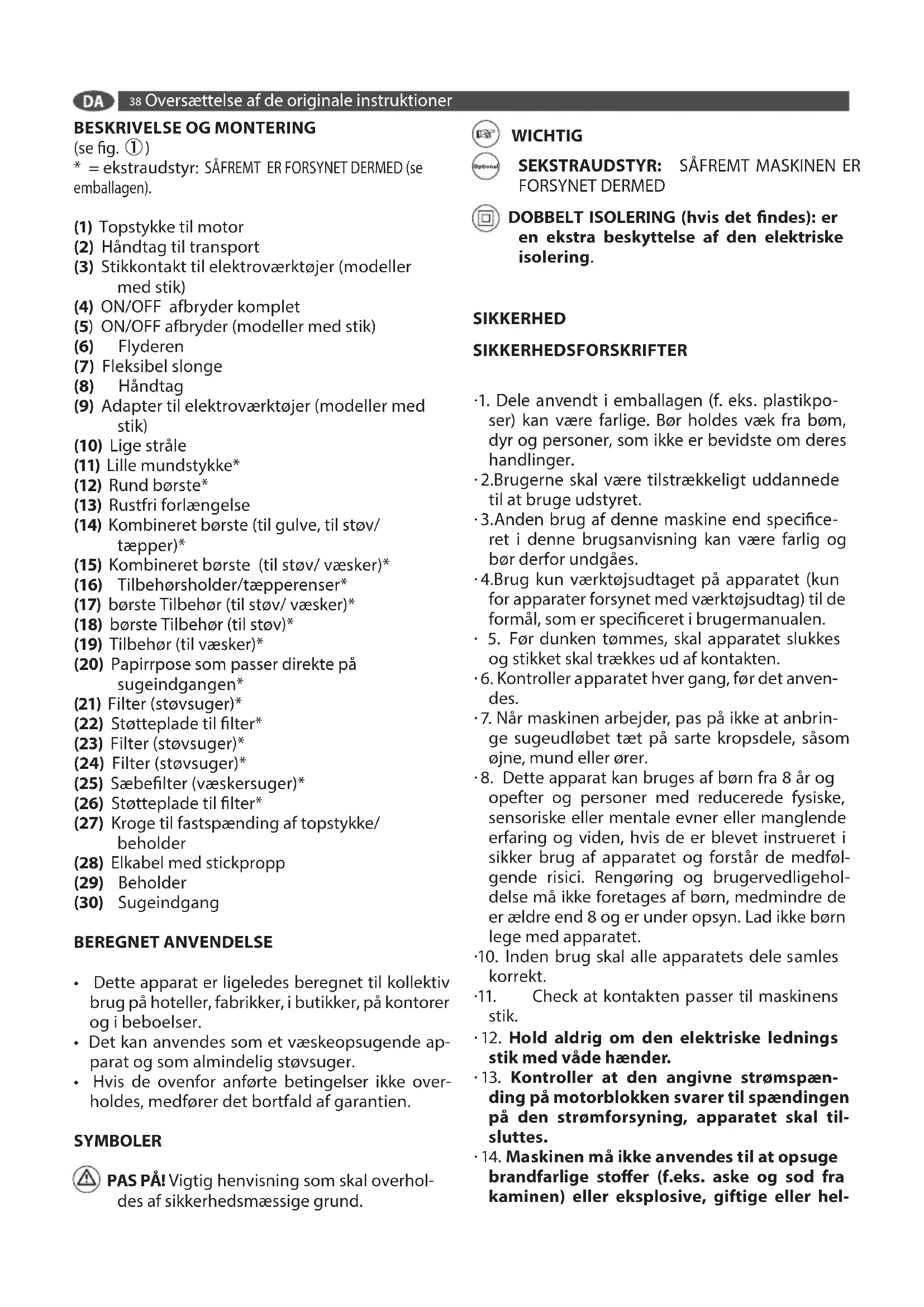 - = ekstraudstyr: SÅFREMT ER FORSYNET DERMED (se emballagen). (1) Topstykke til motor (2) Håndtag til transport (3) Stikkontakt til elektroværktøjer (modeller med stik) (4) ON/OFF afbryder komplet (5) ON/OFF afbryder (modeller med stik) (6) Flyderen (7) Fleksibel slonge (8) Håndtag (9) Adapter til elektroværktøjer (modeller med stik) (10) Lige stråle (11) Lille mundstykke* (12) Rund børste* (13) Rustfri forlængelse (14) Kombineret børste (til gulve, til støv/ tæpper)* (15) Kombineret børste (til støv/ væsker)* (16) Tilbehørsholder/tæpperenser* (17) børste Tilbehør (til støv/ væsker)* (18) børste Tilbehør (til støv)* (19) Tilbehør (til væsker)* (20) Papirrpose som passer direkte på sugeindgangen* (21) Filter (støvsuger)* (22) Støtteplade til lter* (23) Filter (støvsuger)* (24) Filter (støvsuger)* (25) Sæbelter (væskersuger)* (26) Støtteplade til lter* (27) Kroge til fastspænding af topstykke/ beholder (28) Elkabel med stickpropp (29) Beholder (30) Sugeindgang BEREGNET ANVENDELSE