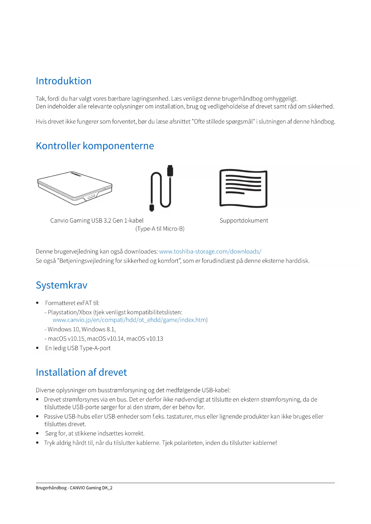 Når jeg forsøger at formatere drevet, får jeg meddelelsen ”Formateringen kunne ikke gennemføres”. Sv.: Dette kan skyldes, at du formaterer drevet med FAT-filsystemet. Prøv filsystemet ”NTFS”. Dette bør løse problemet. TOSHIBA-support Brug for hjælp? Kontakt TOSHIBAs webside med support til harddiske og lagerprodukter: www.toshiba-storage.com/support Oplysninger om garantikrav finder du her: www.toshiba-storage.com/warranty-claims Når du formaterer drevet, slettes alle dataene på det. BEMÆRKBrugerhåndbog - CANVIO Gaming DK_6 Regelerklæringer CE-overensstemmelse Arbejdsmiljø Den elektromagnetiske overensstemmelse (EMC) for dette produkt er blevet kontrolleret typisk for denne produktkategori for et såkaldt bolig-, erhvervs- og letindustrimiljø. Ingen andre arbejdsmiljøer er blevet kontrolleret af Toshiba, og anvendelse af dette produkt i andre arbejdsmiljøer kan være underlagt begrænsninger eller anbefales ikke. De mulige konsekvenser af at anvende dette produkt i arbejdsmiljøer, der ikke er kontrolleret, kan være: forstyrrelse af andre produkter eller af dette produkt i nærtliggende omgivelser med midlertidig fejlfunktion eller datatab/databeskadigelse til følge. Eksempel på ikke-kontrollerede arbejdsmiljøer og relaterede råd: Industrimiljøer (f.eks. hvor der primært anvendes 3-faset 380 V lysnet): fare for forstyrrelse af dette produkt som følge af muligheden for kraftige elektromagnetiske felter, især i nærheden af store maskiner eller kraftanlæg. Medicinske miljøer: Overensstemmelse med medicinalproduktdirektivet er ikke kontrolleret af Toshiba, og dette produkt kan derfor ikke bruges som et medicinalprodukt uden yderligere kontrol. Anvendelse i almindelige kontormiljøer på f.eks. hospitaler bør ikke være noget problem, hvis den ansvarlige administration ikke har fastsat nogen begrænsninger. Bilmiljøer: Læs ejervejledningen til den pågældende bil med henblik på at finde råd om brugen af dette produkt (denne produktkategori). Flymiljøer: Følg flypersonalets instruktioner vedrørende begrænsninger for brugen. Yderligere miljøer, der ikke er relateret til EMC Udendørs brug: Dette produkt er et typisk produkt til brug i hjemmet/på kontorer, og det har derfor ikke nogen særlig modstandsdygtighed over for indtrængen af væske, og det har heller ikke nogen kraftig beskyttelse mod slag. Eksplosive atmosfærer: Brug af dette produkt i sådanne særlige arbejdsmiljøer (Ex) er ikke tilladt. Nedenstående information gælder kun for EU-lande: REACH – overensstemmelseserklæring Toshiba vil overholde alle REACH-krav og tilstræber at give kunderne oplysninger om de kemiske stoffer i vores produkter i overensstemmelse med REACH-reglerne. Bortskaffelse af produkter Følgende information er kun gældende for Tyrkiet: Overholder AEEE-regulativet. Dette produkt er CE-mærket i overensstemmelse med de relevante EU-direktivers krav. Ansvarlig for CE-mærkningen er Toshiba Electronics Europe GmbH, Hansaallee 181, 40549 Düsseldorf, Tyskland. Anvendelsen af dette symbol betyder, at dette produkt ikke må behandles som almindeligt affald. Ved at sikre at dette produkt bortskaffes korrekt er du med til at forhindre eventuel negativ påvirkning af miljø og sundhed, som ellers kunne forekomme på grund af forkert bortskaffelse af dette produkt. Hvis du ønsker yderligere oplysninger om genbrug af dette produkt, bedes du kontakte din kommune, det lokale genbrugsanlæg eller den forretning, hvor du købte produktet.Meddelelser ©2020 TOSHIBA Electronics Europe GmbH. Alle rettigheder forbeholdes. TOSHIBA forbeholder sig retten til at foretage tekniske ændringer. TOSHIBA påtager sig intet ansvar for skader, der opstår direkte eller indirekte som følge af fejl, udeladelser eller uoverensstemmelser mellem dette produkt og dokumentationen. Toshiba-navnet og dets logoer er registrerede varemærker, der tilhører Toshiba. macOS er et varemærke, der tilhører Apple Inc. Andre virksomhedsnavne, produktnavne og tjenestenavne kan være varemærker, der tilhører deres respektive virksomheder. Produktspecifikationer, konfigurationer, farver, komponenter og tjenester kan ændres uden varsel. En gigabyte (GB) betyder en milliard bytes, og en terabyte (TB) betyder en billion bytes. Den totale kapacitet til rådighed varierer afhængigt af brugsmiljøet, og dine resultater og lagerkapacitet vil variere i overensstemmelse hermed. En computers operativsystem rapporterer imidlertid lagerkapaciteten som potenser af 2 i definitionen af 1TB = 2