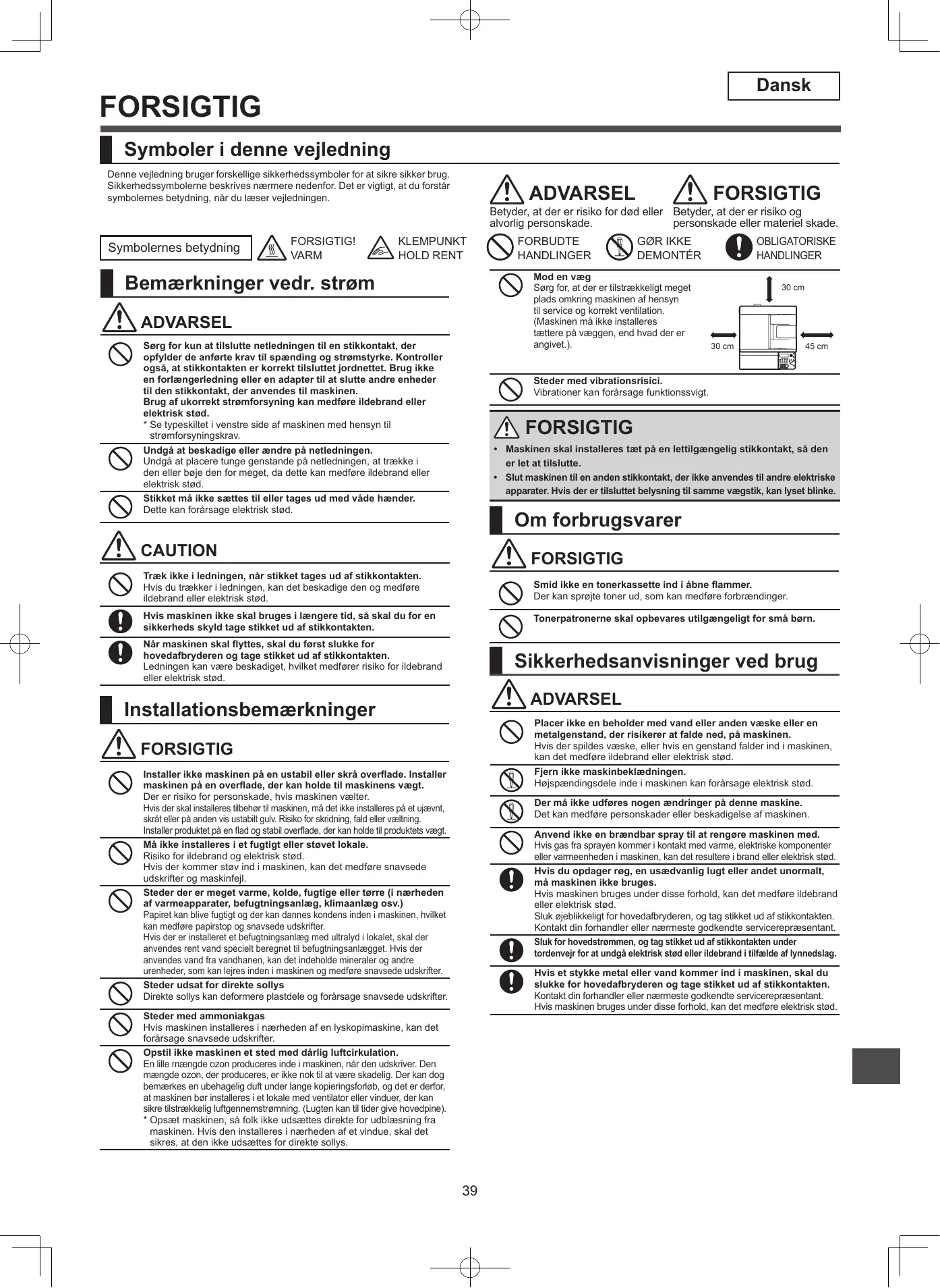Se ikke direkte ind i lyskilden. Det kan medføre øjenskader. Dæk ikke maskinens ventilationshuller til. Installer ikke maskinen på et sted, der dækker ventilationshullerne til. Hvis ventilationshullerne dækkes til, kan det overophede maskinen og medføre risiko for ildebrand. Fuserenheden og papirudlægningsområdet er varme. Når du fjerner fastkørt papir, må du ikke røre ved fuserenheden og papirudlægningsområdet. Pas på ikke at brænde dig selv. Når du lægger papir i maskinen, fjerner fastkørt papir, foretager vedligeholdelse, lukker lågerne foran og på siden samt sætter bakker i og tager dem ud, skal du passe på ikke at få fingrene i klemme.