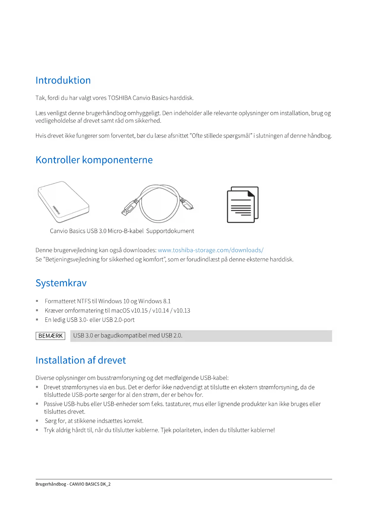Når jeg forsøger at formatere drevet, får jeg meddelelsen ”Formateringen kunne ikke gennemføres”. Sv.: Dette kan skyldes, at du formaterer drevet med FAT-filsystemet. Prøv filsystemet ”NTFS”. Dette bør løse problemet. TOSHIBA-support Brug for hjælp? Kontakt TOSHIBAs webside med support til harddiske og lagerprodukter: www.toshiba-storage.com/support Oplysninger om garantikrav finder du her: www.toshiba-storage.com/warranty-claims Regelerklæringer CE-overensstemmelse Når du formaterer drevet, slettes alle dataene på det. Dette produkt er CE-mærket i overensstemmelse med de relevante EU-direktivers krav. Ansvarlig for CE-mærkningen er Toshiba Electronics Europe GmbH, Hansaallee 181, 40549 Düsseldorf, Tyskland. BEMÆRKBrugerhåndbog - CANVIO BASICS DK_7 Arbejdsmiljø Den elektromagnetiske overensstemmelse (EMC) for dette produkt er blevet kontrolleret typisk for denne produktkategori for et såkaldt bolig-, erhvervs- og letindustrimiljø. Ingen andre arbejdsmiljøer er blevet kontrolleret af Toshiba, og anvendelse af dette produkt i andre arbejdsmiljøer kan være underlagt begrænsninger eller anbefales ikke. De mulige konsekvenser af at anvende dette produkt i arbejdsmiljøer, der ikke er kontrolleret, kan være: forstyrrelse af andre produkter eller af dette produkt i nærtliggende omgivelser med midlertidig fejlfunktion eller datatab/databeskadigelse til følge. Eksempel på ikke-kontrollerede arbejdsmiljøer og relaterede råd: Industrimiljøer (f.eks. hvor der primært anvendes 3-faset 380 V lysnet): fare for forstyrrelse af dette produkt som følge af muligheden for kraftige elektromagnetiske felter, især i nærheden af store maskiner eller kraftanlæg. Medicinske miljøer: Overensstemmelse med medicinalproduktdirektivet er ikke kontrolleret af Toshiba, og dette produkt kan derfor ikke bruges som et medicinalprodukt uden yderligere kontrol. Anvendelse i almindelige kontormiljøer på f.eks. hospitaler bør ikke være noget problem, hvis den ansvarlige administration ikke har fastsat nogen begrænsninger. Bilmiljøer: Læs ejervejledningen til den pågældende bil med henblik på at finde råd om brugen af dette produkt (denne produktkategori). Flymiljøer: Følg flypersonalets instruktioner vedrørende begrænsninger for brugen. Yderligere miljøer, der ikke er relateret til EMC Udendørs brug: Dette produkt er et typisk produkt til brug i hjemmet/på kontorer, og det har derfor ikke nogen særlig modstandsdygtighed over for indtrængen af væske, og det har heller ikke nogen kraftig beskyttelse mod slag. Eksplosive atmosfærer: Brug af dette produkt i sådanne særlige arbejdsmiljøer (Ex) er ikke tilladt. Nedenstående information gælder kun for EU-lande: REACH – overensstemmelseserklæring Toshiba vil overholde alle REACH-krav og tilstræber at give kunderne oplysninger om de kemiske stoffer i vores produkter i overensstemmelse med REACH-reglerne. Bortskaffelse af produkter Følgende information er kun gældende for Tyrkiet: Overholder AEEE-regulativet. Anvendelsen af dette symbol betyder, at dette produkt ikke må behandles som almindeligt affald. Ved at sikre at dette produkt bortskaffes korrekt er du med til at forhindre eventuel negativ påvirkning af miljø og sundhed, som ellers kunne forekomme på grund af forkert bortskaffelse af dette produkt. Hvis du ønsker yderligere oplysninger om genbrug af dette produkt, bedes du kontakte din kommune, det lokale genbrugsanlæg eller den forretning, hvor du købte produktet.Meddelelser ©2020 TOSHIBA Electronics Europe GmbH. Alle rettigheder forbeholdes. TOSHIBA forbeholder sig retten til at foretage tekniske ændringer. TOSHIBA påtager sig intet ansvar for skader, der opstår direkte eller indirekte som følge af fejl, udeladelser eller uoverensstemmelser mellem dette produkt og dokumentationen. Toshiba-navnet og dets logoer er registrerede varemærker, der tilhører Toshiba. macOS er et varemærke, der tilhører Apple Inc. Andre virksomhedsnavne, produktnavne og tjenestenavne kan være varemærker, der tilhører deres respektive virksomheder. Produktspecifikationer, konfigurationer, farver, komponenter og tjenester kan ændres uden varsel. En gigabyte (GB) betyder en milliard bytes, og en terabyte (TB) betyder en billion bytes. Den totale kapacitet til rådighed varierer afhængigt af brugsmiljøet, og dine resultater og lagerkapacitet vil variere i overensstemmelse hermed. En computers operativsystem rapporterer imidlertid lagerkapaciteten som potenser af 2 i definitionen af 1TB = 2