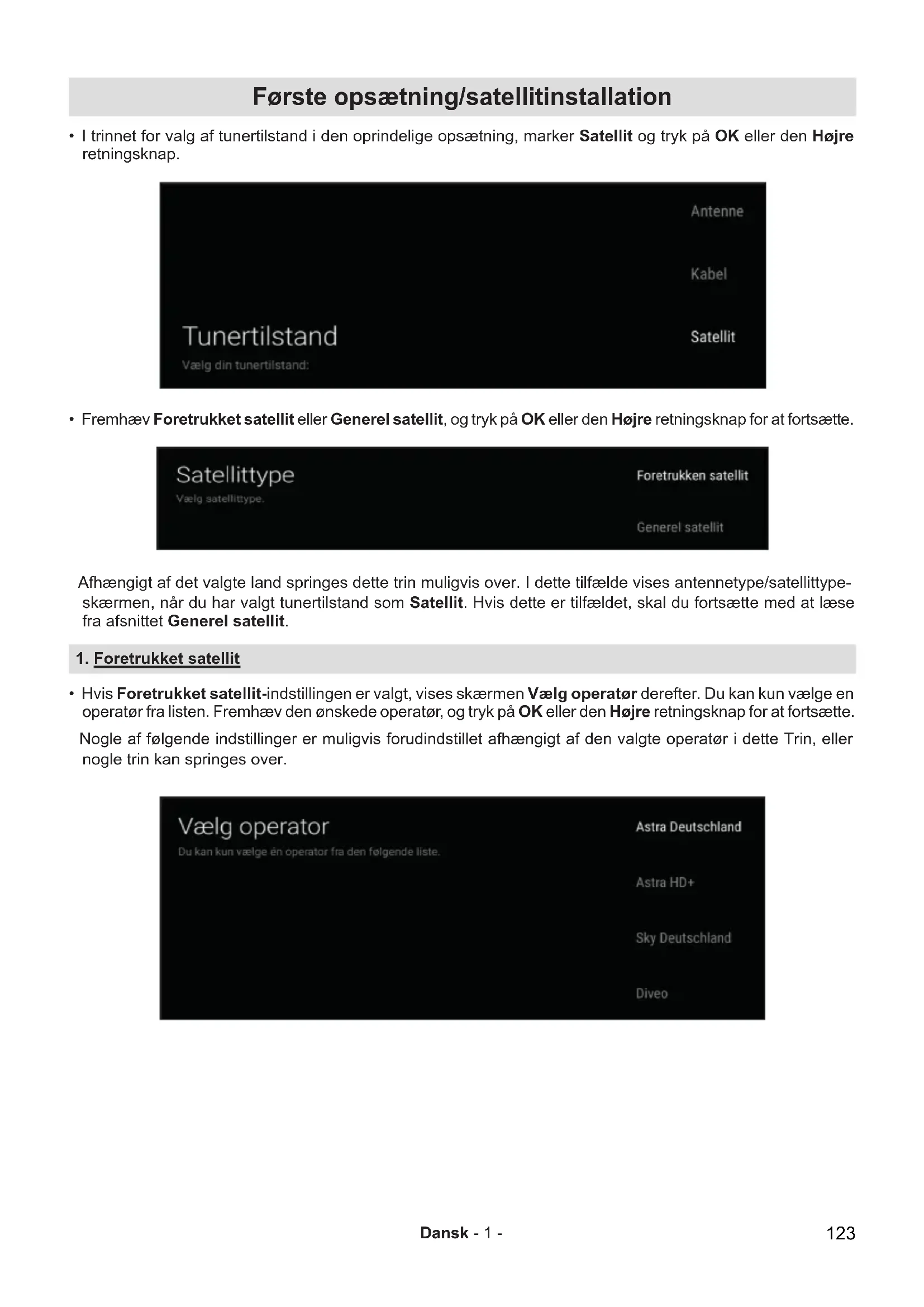 - Hvis Foretrukket satellit-indstillingen er valgt, vises skærmen Vælg operatør derefter. Du kan kun vælge en operatør fra listen. Fremhæv den ønskede operatør, og tryk på OK eller den Højre retningsknap for at fortsætte. Nogle af følgende indstillinger er muligvis forudindstillet afhængigt af den valgte operatør i dette Trin, eller nogle trin kan springes over. 123Dansk - 2 - 1.1. Antennetype - Direct